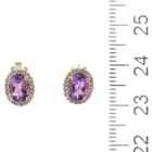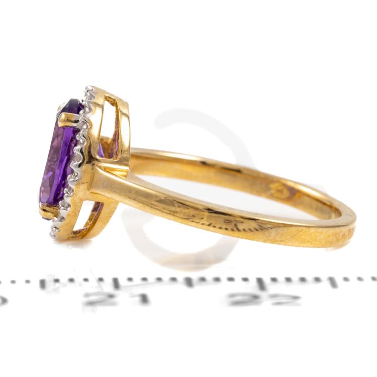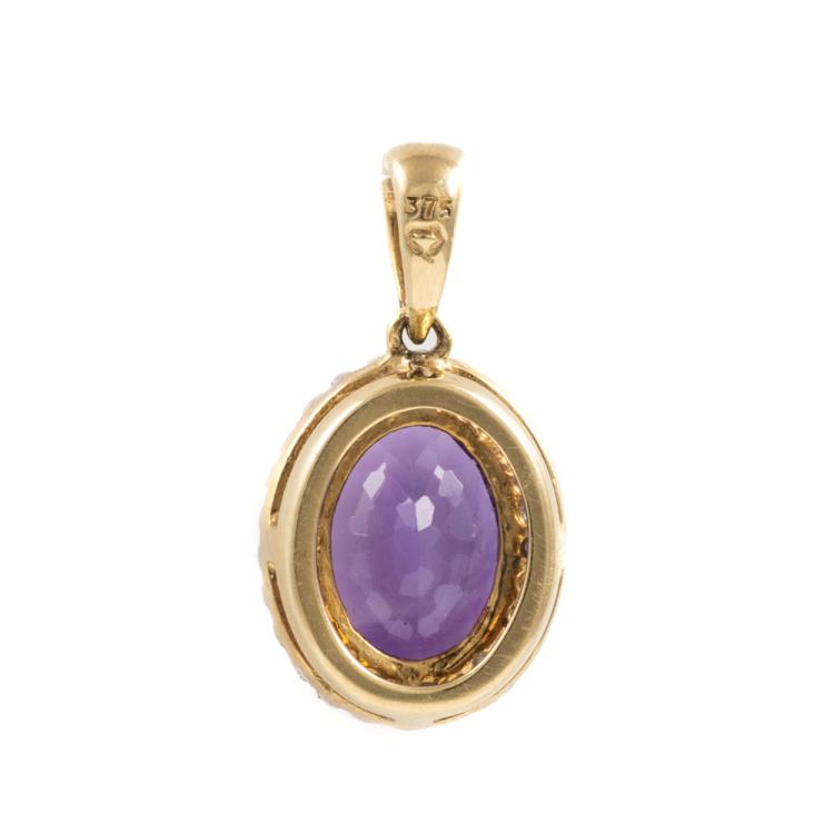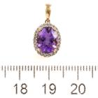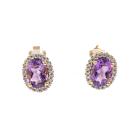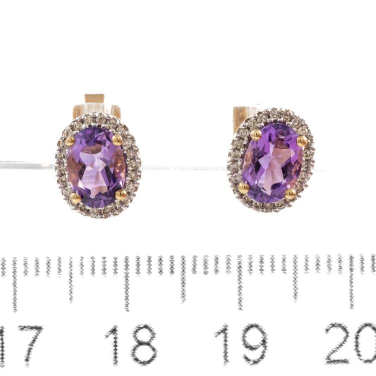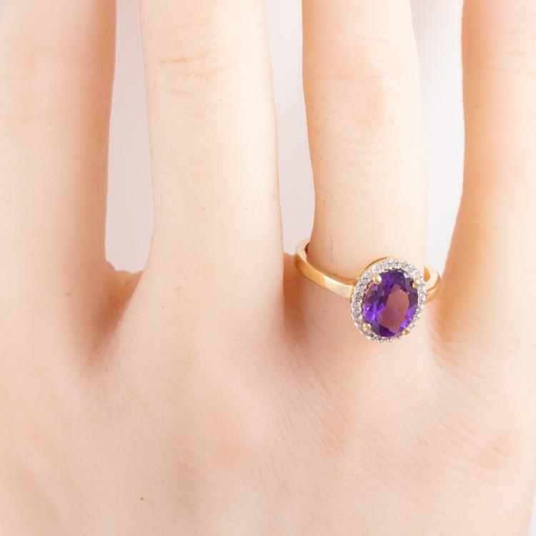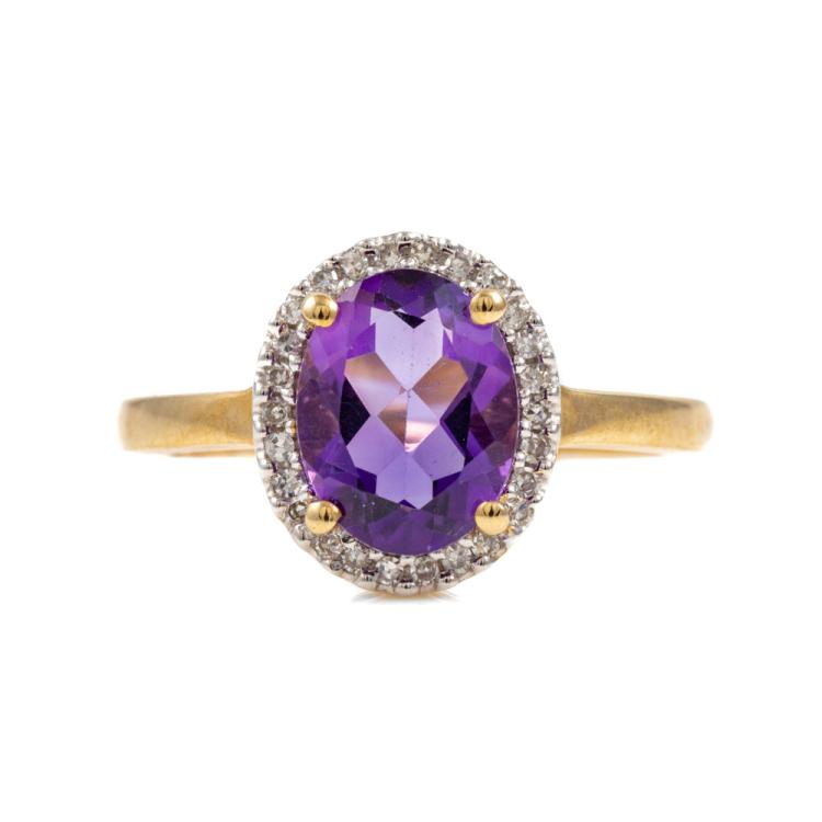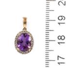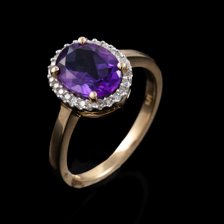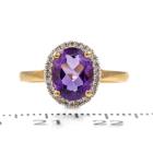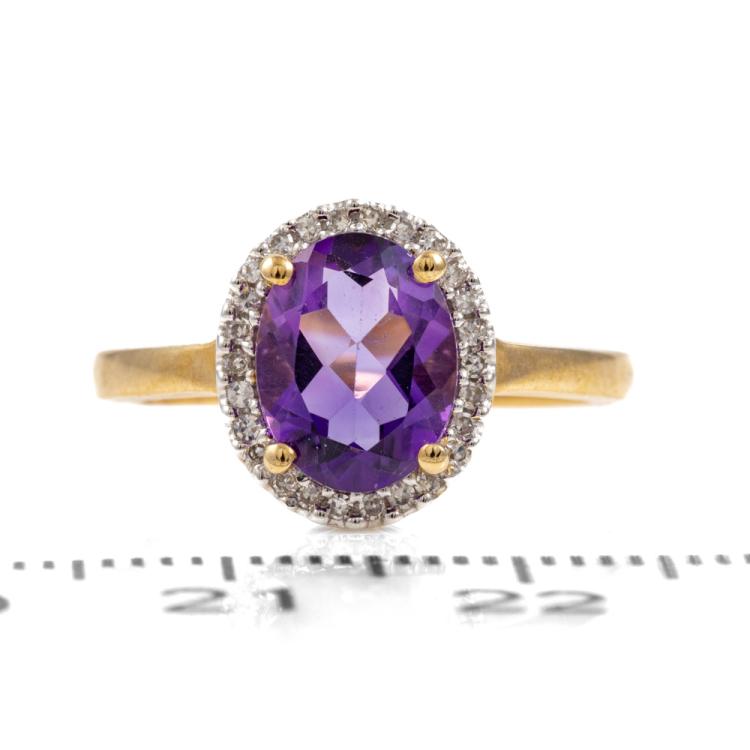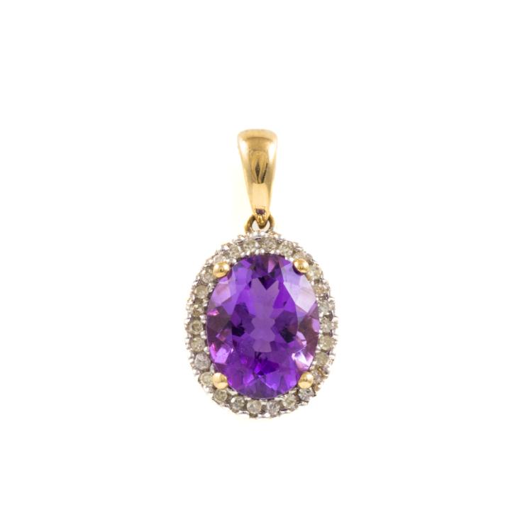 Three piece Amethyst set: incl. 1) Amethyst ring with centre oval Natural Amethyst of approx. 1.50cts (9.0 x 7.0mm) & round Natural Diamonds totalling 0.10cts. Ring size L. Band width: 1.8mm. 2) Amethyst earrings with Natural Amethyst totalling approx. 1.50cts & round Natural Diamonds of 0.15cts. 3) Amethyst pendant with oval Amethyst of approx. 1.50cts (9.0 x 7.0mm) & round Natural Diamonds totalling 0.10cts. All 9ct yellow & white gold. Combined weight: 6.0g (As new)^