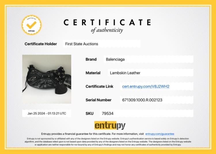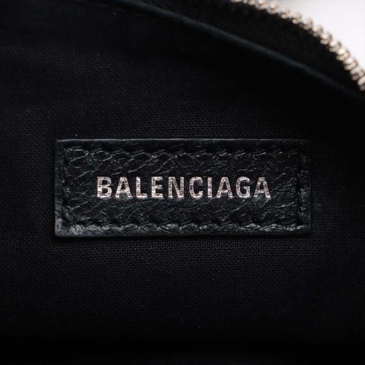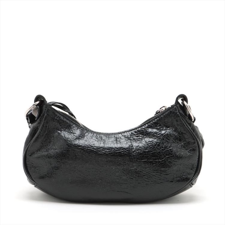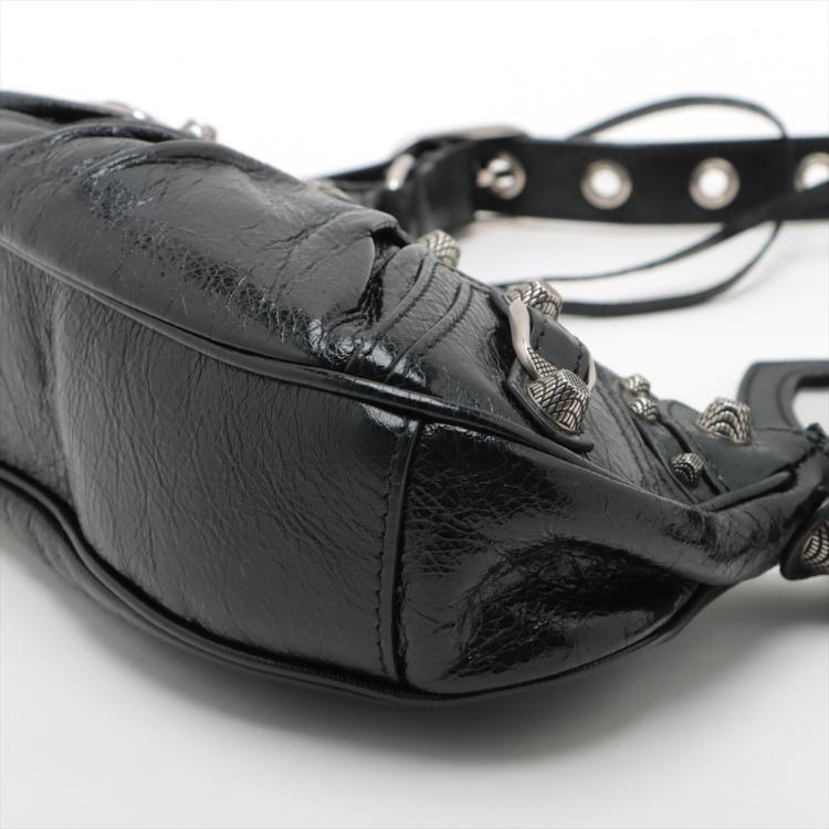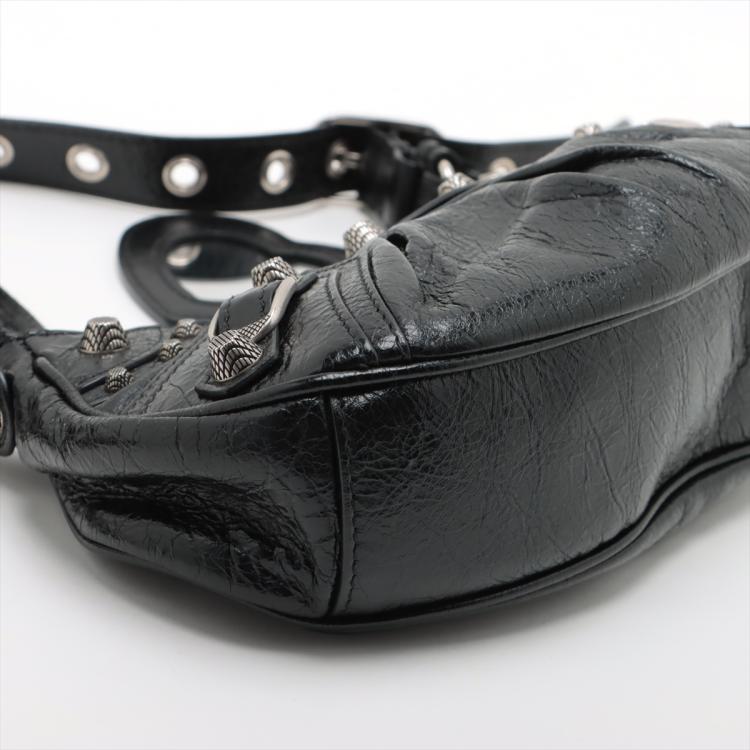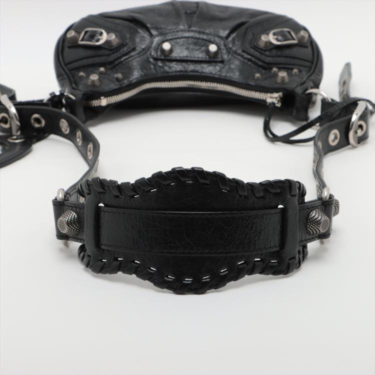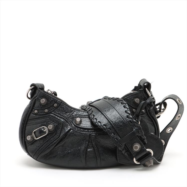 Balenciaga Le Cagole shoulder bag XS in black leather. Featuring half-moon shape, studs and buckle detail on body and strap, silver-toned hardware, top zip closure. The top opens to a black fabric interior. Approximate dimensions: 24.5cm(L) x 13.5cm(H) x 6cm(D), 55cm adjustable shoulder height. Accompanied by a heart shape mirror charm, coin purse, info cards and dust bag. With Entrupy Certificate of Authenticity. (Pre-owned)