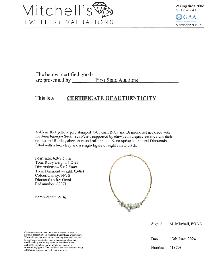 Pearl, Ruby and Diamond necklace with 14 Baroque Pearls of 6mm - 7.5mm, 7 marquise cut natural Rubies totalling 1.24ct and round natural Diamonds totalling 0.68ct (Estimated grading: H VS). 18ct yellow gold. Length: 42cm. Weight: 35.0g. With Certificate #418793. (Pre-owned)