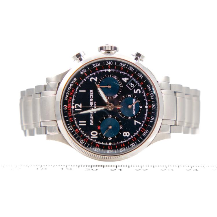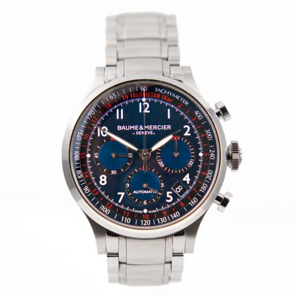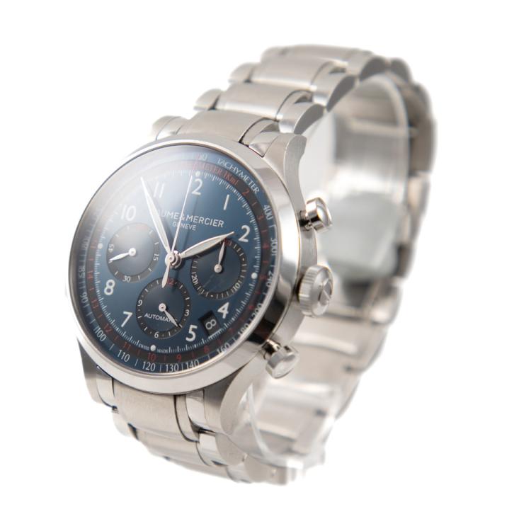 Baume & Mercier Capeland stainless steel automatic mens watch. Blue chronograph dial, date, case diameter: 44mm, wrist size: 21cm, Swiss made. Ref# M0A10066. With Baume & Mercier stainless steel bracelet and clasp. With Certificate of Authenticity, Baume & Mercier International Warranty card dated 05/11/2012 and Baume & Mercier box. 3 month FSA warranty. (Pre-owned)