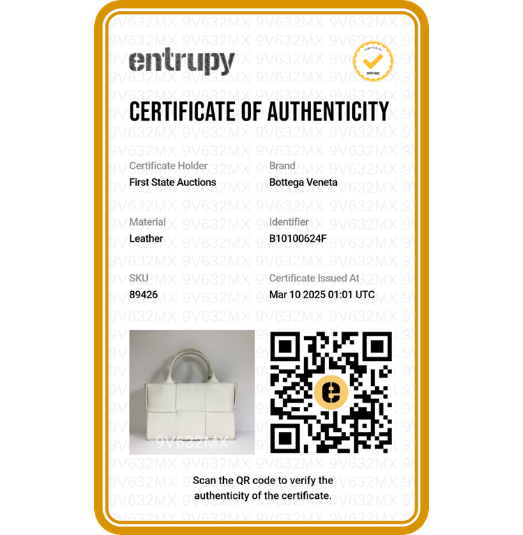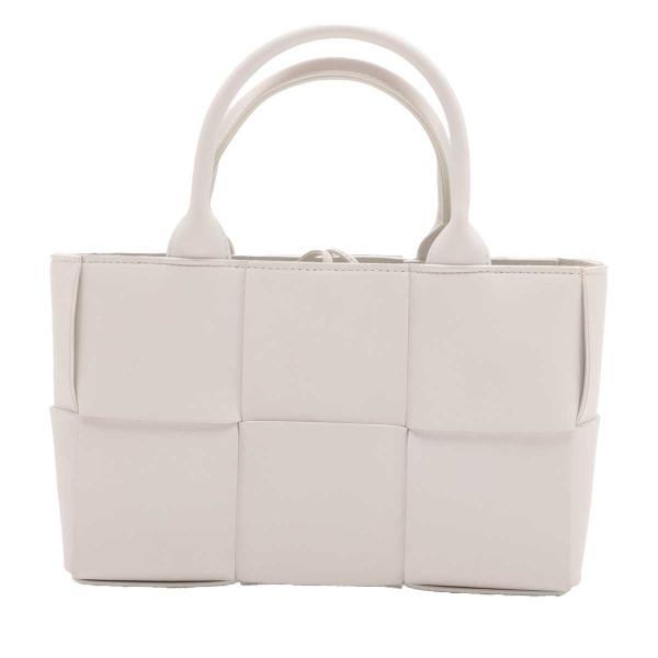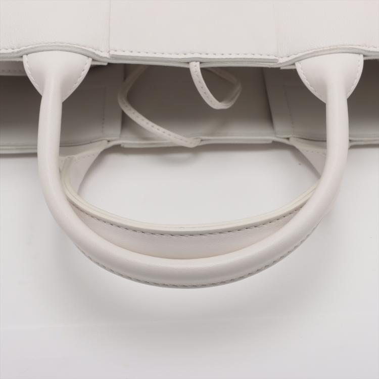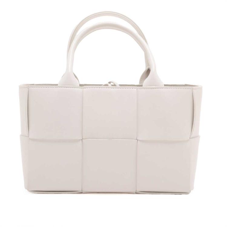 Bottega Veneta Mini Arco tote bag in white lambskin Leather. Featuring gold-tone hardware, dual leather top handles, a detachable leather strap, a detachable interior zippered pouch. The top with leather string closure opens to white leather interior. Approximate dimensions: 25cm(L) x 16cm(H) x 8cm(D), handle drop 11cm and 50cm strap drop, adjustable. Accompanied by Bottega Veneta dustbags. With Entrupy Certificate of Authenticity. (Pre-owned)