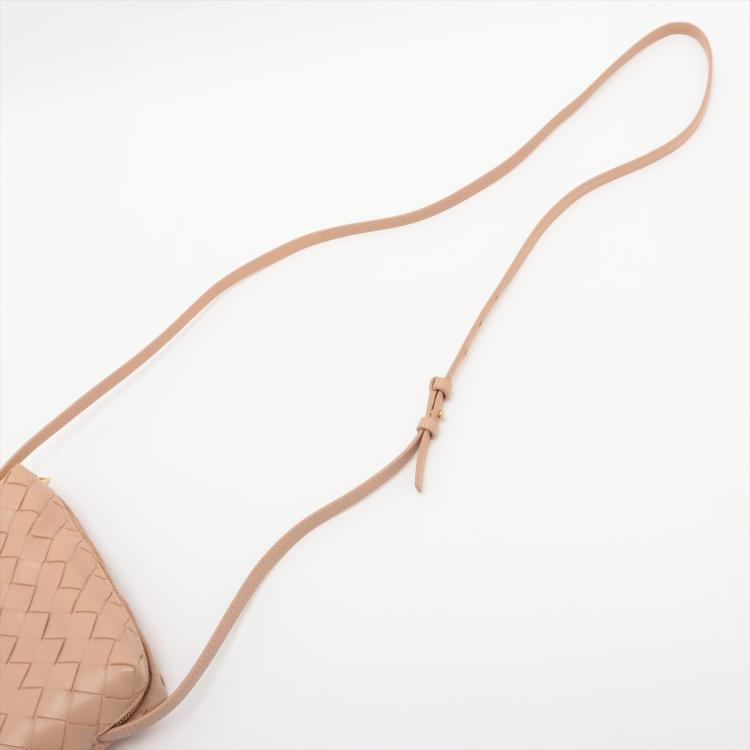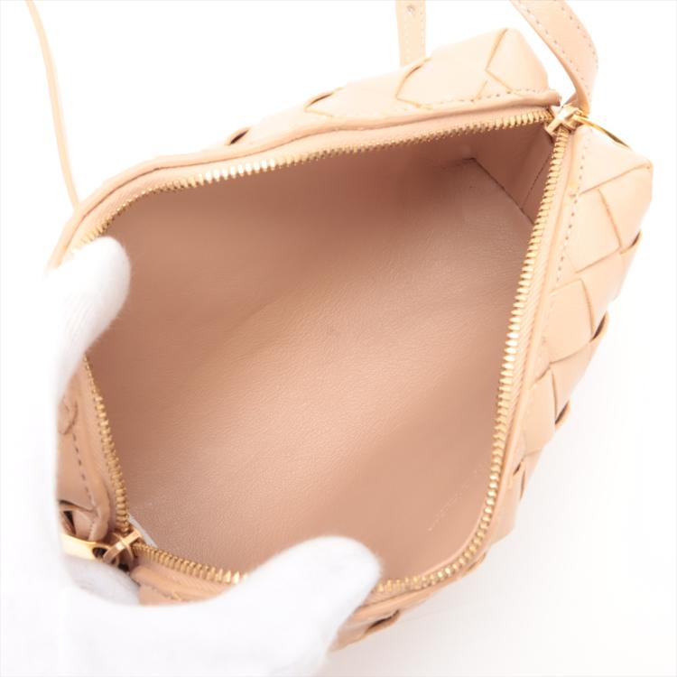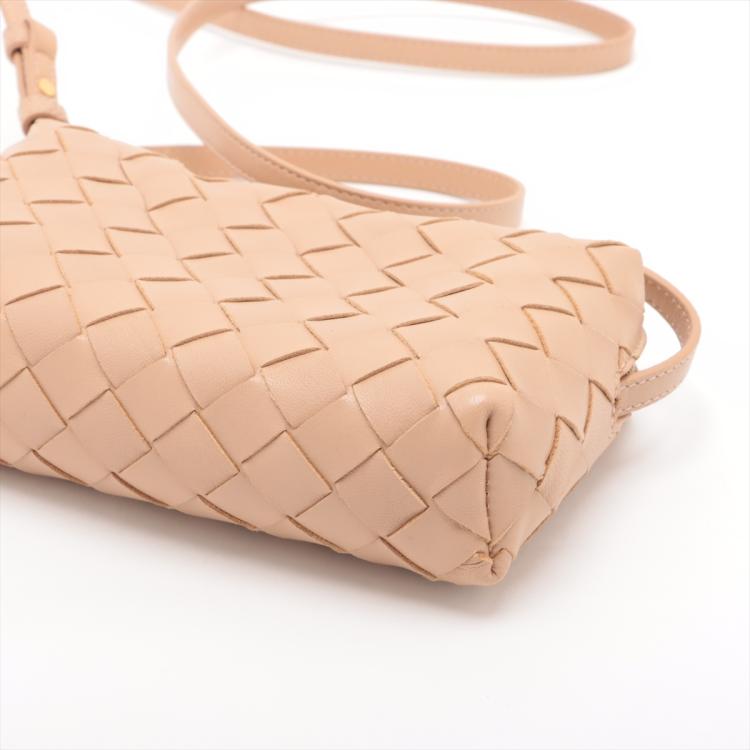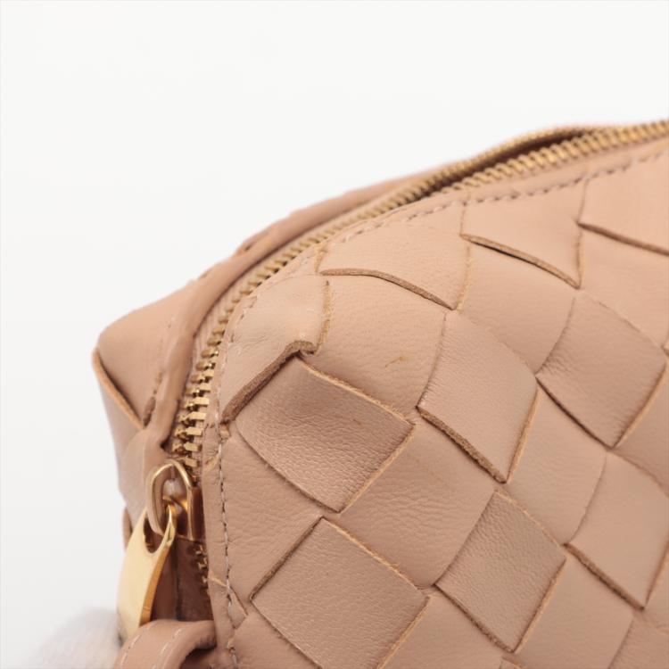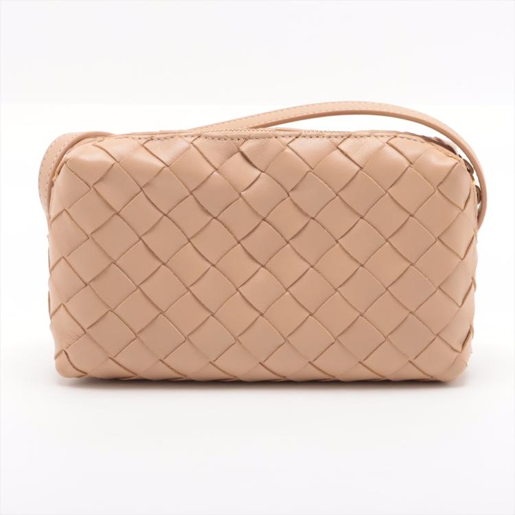 Bottega Veneta mini loop camera bag in Intrecciato beige Nappa lambskin leather. Featuring gold-tone hardware, a crossbody shoulder strap, and the top two way zippers open to a matching beige leather interior. Approximate dimensions: 18cm(L) x 10cm(H) x 4.5m(D), 63cm leather strap drop, adjustable. With Entrupy Certificate of Authenticity. (Pre-owned)