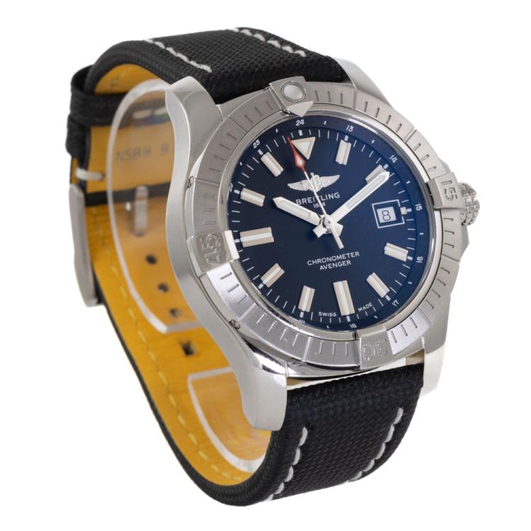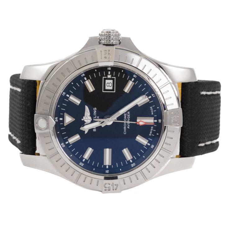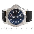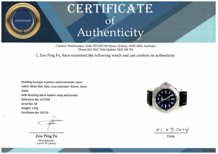 Breitling Avenger stainless steel automatic mens watch. Black dial, date, case diameter: 43mm, strap length: 21cm, Swiss made. Ref# A17318. With Breitling black leather strap and buckle. With Certificate of Authenticity, Undated Breitling warranty card and Breitling box. 3 month FSA warranty (Pre-owned)