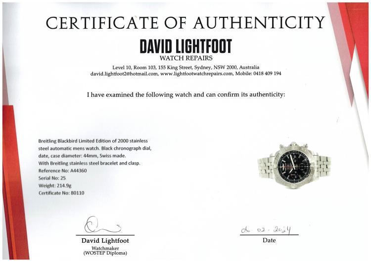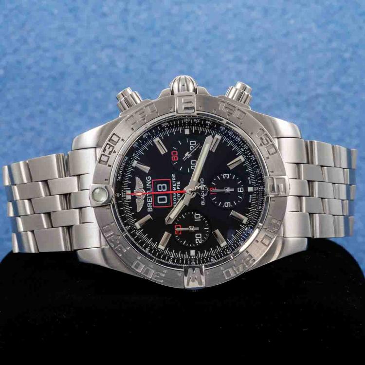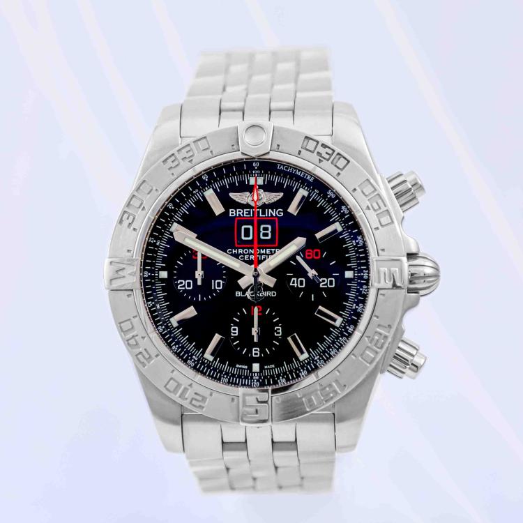 Breitling Blackbird Chronomat Limited Edition of 2000 stainless steel automatic mens watch. Black chronograph dial, date, case diameter: 44mm, wrist size: 19cm, Swiss made. Ref #A44360. With Breitling stainless steel bracelet and clasp. With Certificate of Authenticity and Breitling box. 3 month FSA warranty (Pre-owned)