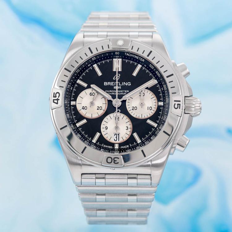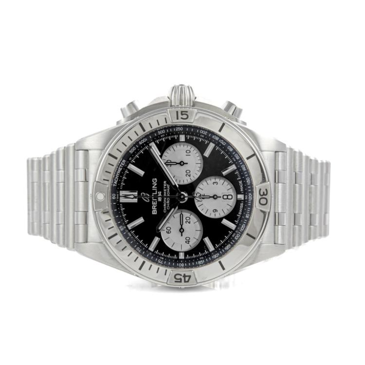Breitling Chronomat stainless steel automatic mens watch. Black chronograph dial, date, case diameter: 42mm, wrist size: 19.5cm, Swiss made. Ref# AB0134. With Breitling stainless steel bracelet and clasp. With Certificate of Authenticity, Undated Breitling International warranty card and Breitling box. 3 month FSA warranty (Pre-owned)
