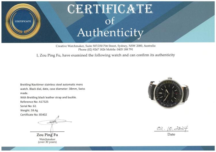 Breitling Navitimer stainless steel automatic mens watch. Black dial, date, case diameter: 38mm, strap length including the case: 17.5cm, Swiss made. Ref #A17325. With Breitling black leather strap and buckle. With Certificate of Authenticity. 3 month FSA warranty. (Pre-owned)