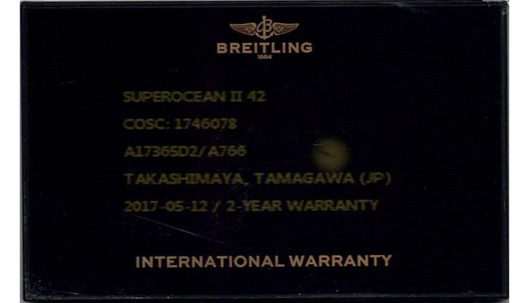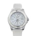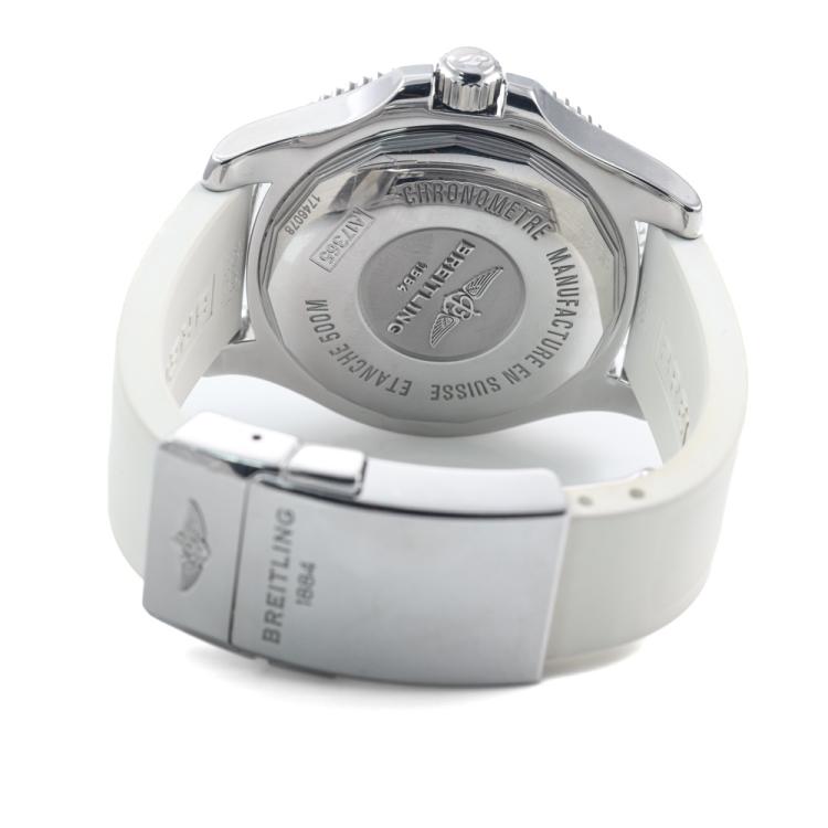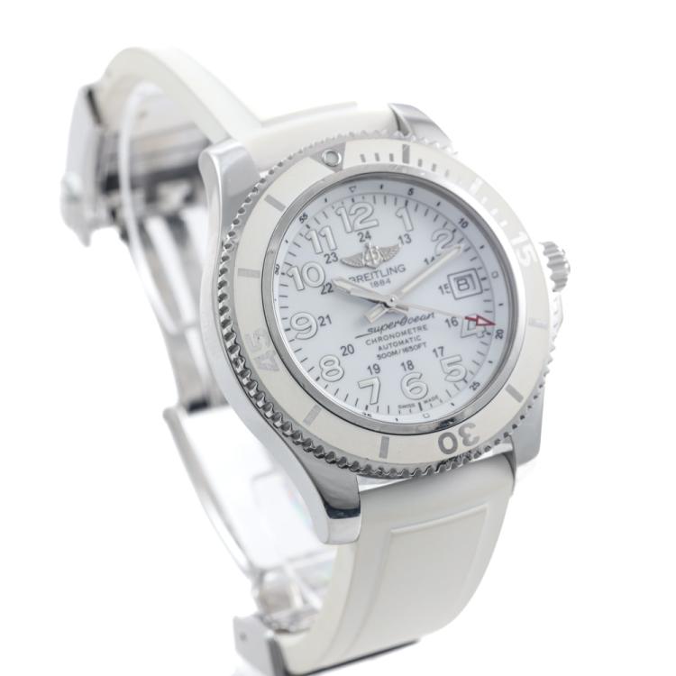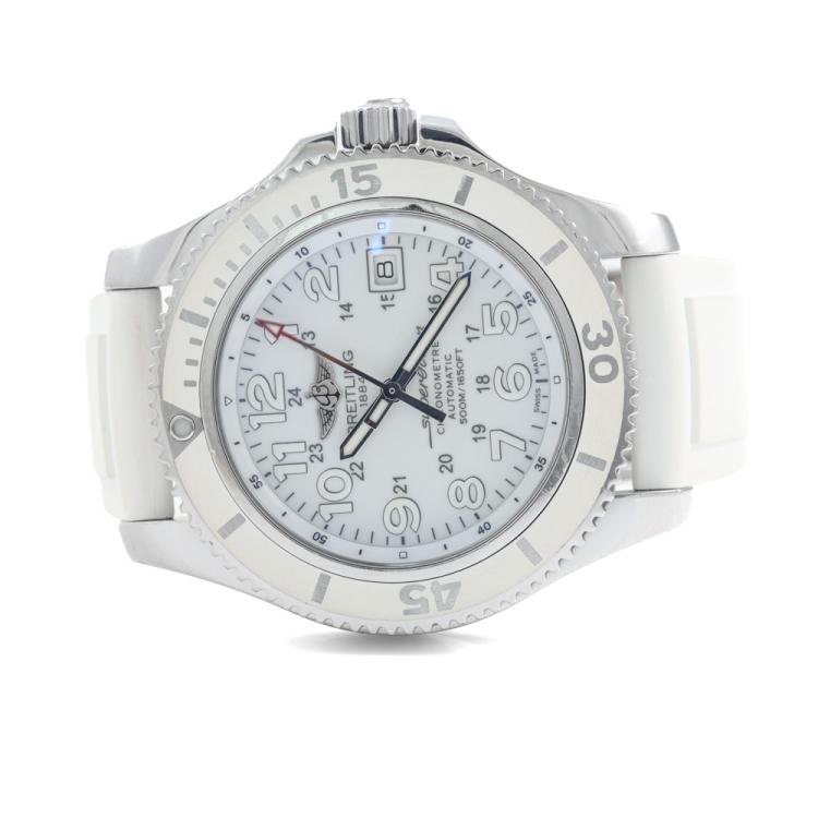 Breitling Superocean II stainless steel automatic mens watch. White dial, date, case diameter: 42mm, adjustable max wrist size: 15cm, Swiss made. Ref# A17365. With Breitling white rubber strap and clasp. With Certificate of Authenticity, Breitling E-warranty card dated 12/05/2017 and Breitling box. 3 month FSA warranty (Pre-owned).