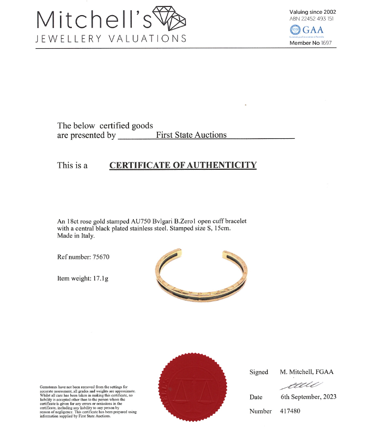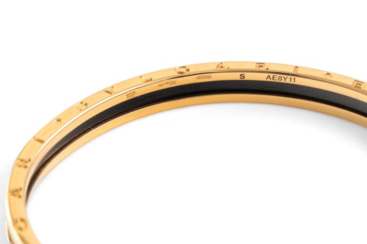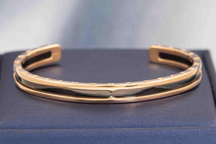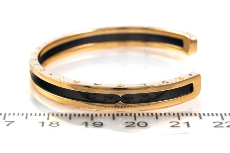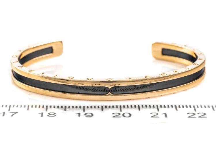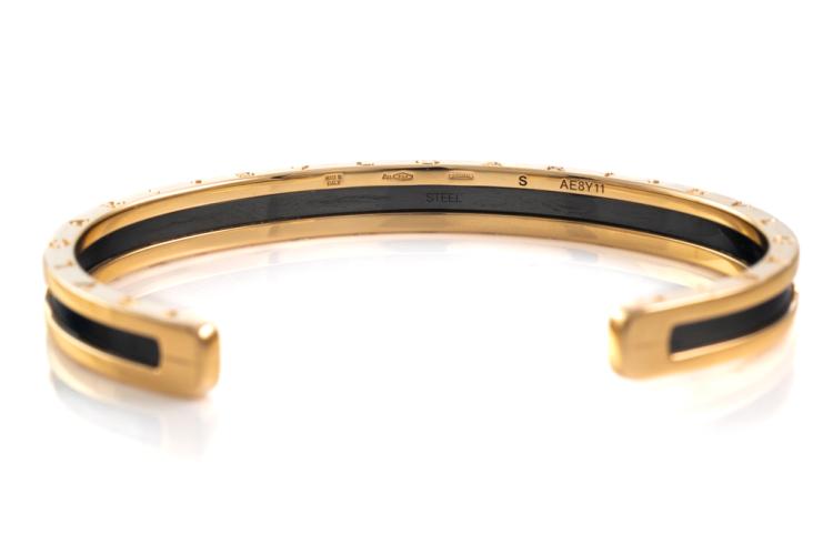 Bvlgari B.Zero1 open cuff bangle. 18ct rose gold and black plated stainless steel. Bvlgari stamped size S - circumference: 15cm. Made in Italy. Weight: 17.1g. With Certificate #417480. (Pre-owned)