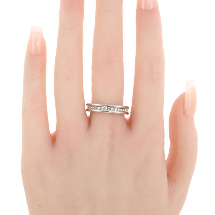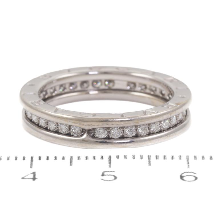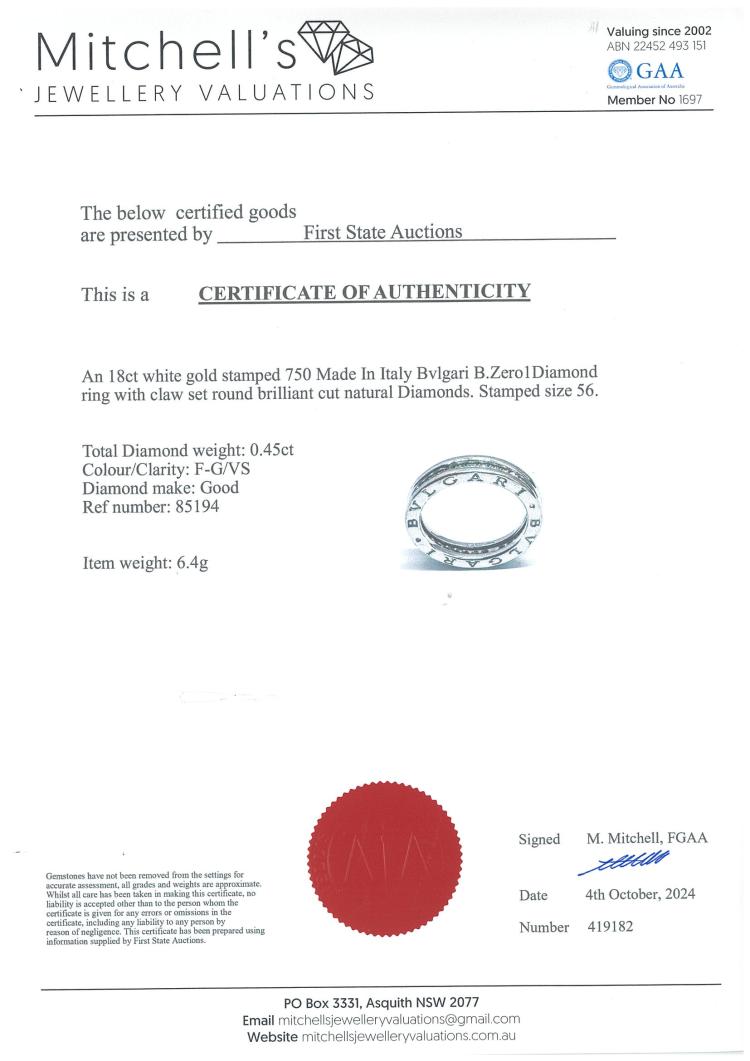 Bvlgari B.Zero1 Diamond one band ring with full hoop round Natural Diamonds totalling approximately 0.45ct (Estimated grading: F-G VS). 18ct white gold. Bvlgari stamped size 56, L - ring resizing is not recommended. Width: 4.4mm. Weight: 6.4g. With Certificate: #419182 and Bvlgari box. (Pre-owned)