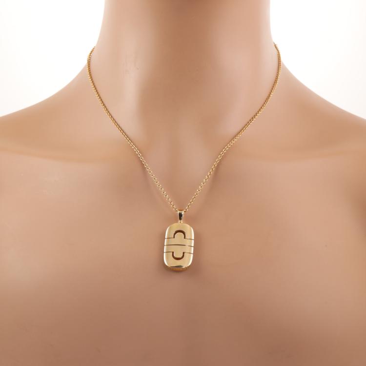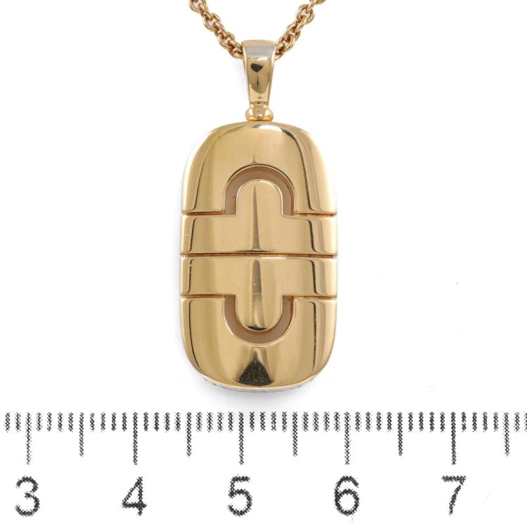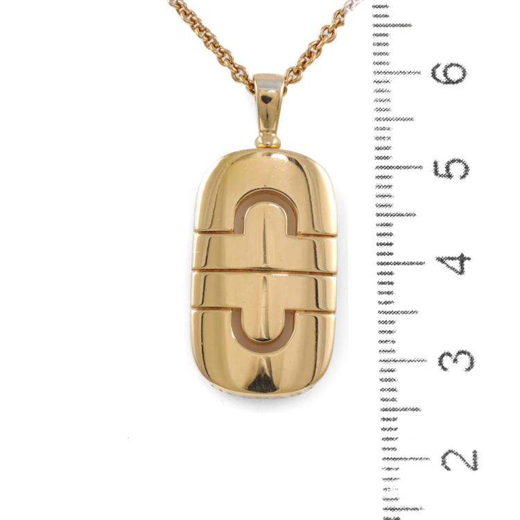 Bvlgari Parentesi necklace. 18ct yellow gold with Bvlgari 18ct yellow gold chain. Motif size: 15mm x 25mm. Adjustable length: 38.0cm - 45.5cm. Weight: 15.2g. With Bvlgari box. With Certificate #419868. (Pre-owned)