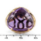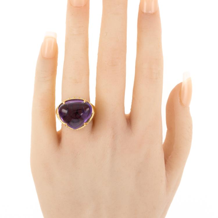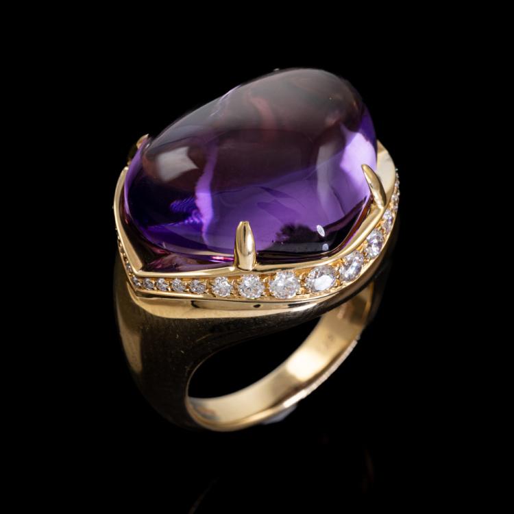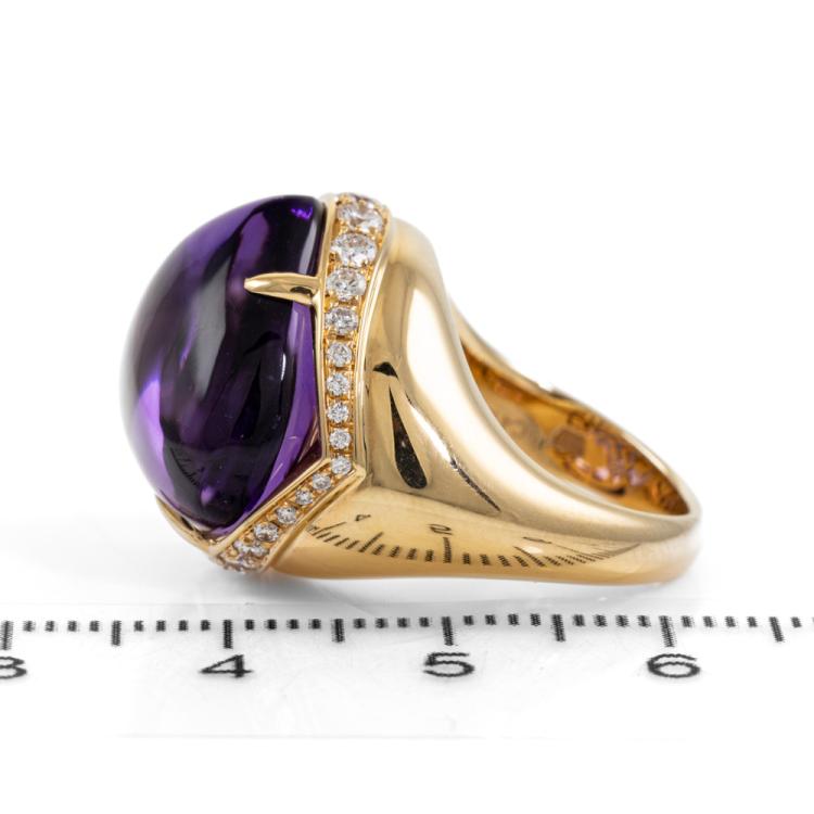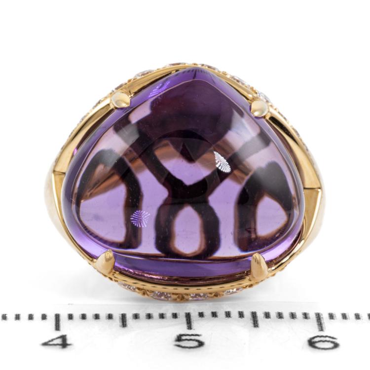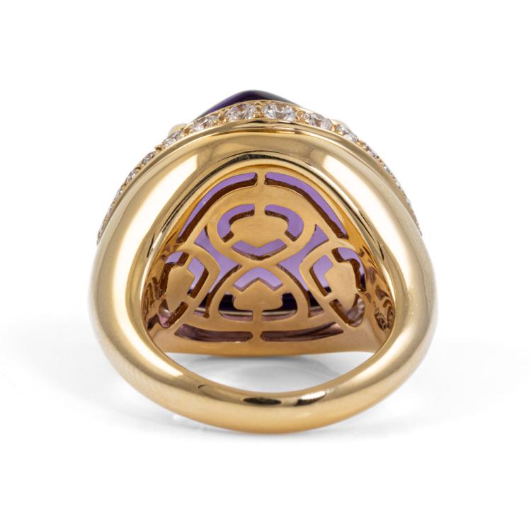 Bvlgari Mediterranean Eden Sassi ring with a pear shaped cabochon cut Amethyst of size 16.50mm x 19.15mm and round natural Diamonds totalling 0.66ct (Estimated grading F VS). 18ct yellow gold. Ring size I 1/4 - ring resizing is not recommended. Made in Italy. Weight 14.3g. With Bvlgari box. With Certificate #418796. (Pre-owned)