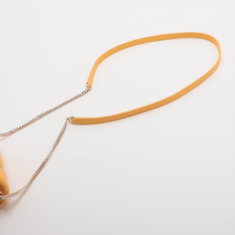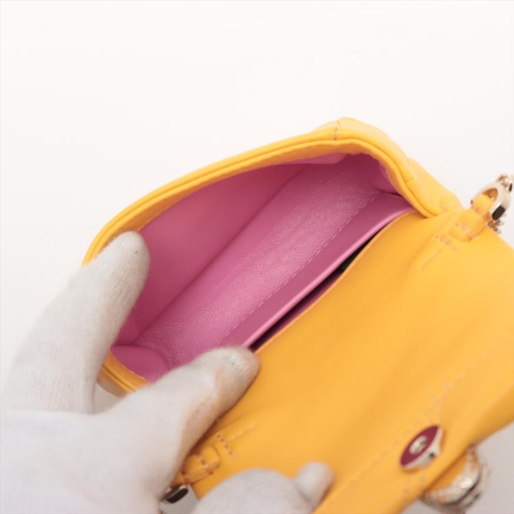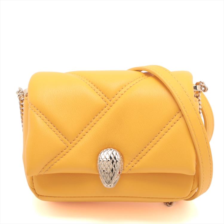 Bvlgari Serpenti Cabochon micro bag in yellow maxi matelassé calf leather. Featuring gold-tone hardware, frontal flap with the heritage snakehead magnetic closure. The flap opens to a pink Nappa leather lining interior with a flat pocket. Approximate dimensions: 11cm(L) x 9cm(H) x 4cm(D), 8cm handle drop and 47cm leather-chain strap drop. Accompanied by a Bvlgari certificate (dated 11/01/2023), dust bag and box. With Luxury Australia Authentication Certificate. (Pre-owned)