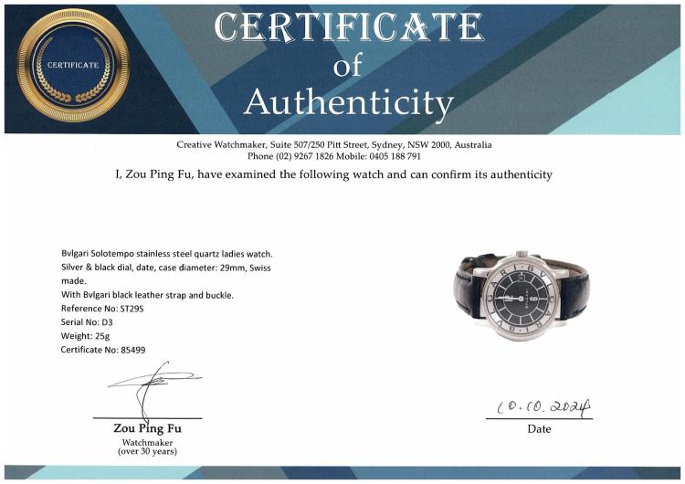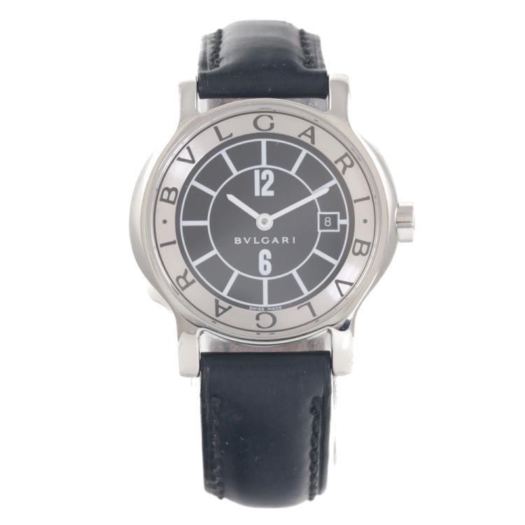 Bvlgari Solotempo stainless steel quartz ladies watch. Silver & black dial, date, case diameter: 29mm, strap length including case: 17cm, Swiss made. Ref# ST29S. With Bvlgari black leather strap and buckle. With Certificate of Authenticity and Bvlgari box. 3 month FSA warranty (Pre-owned)