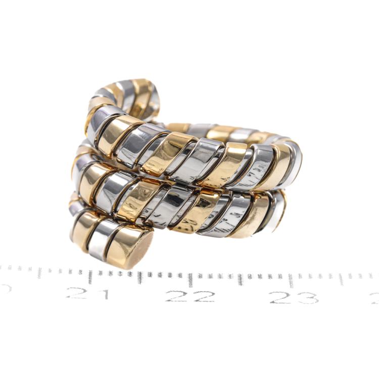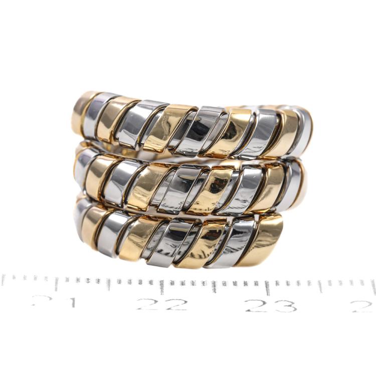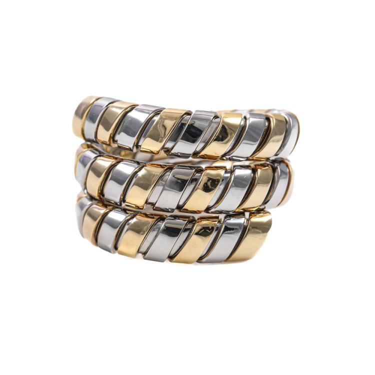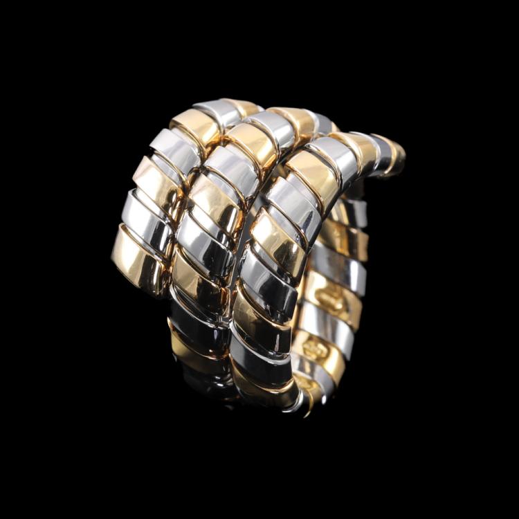 Bvlgari Tubogas Spiral ring. 18ct yellow and white gold. Ring size J and is flexible to sizes up. Band width: 10.0mm - 15.3mm. Weight: 10.2g. (Pre-owned)