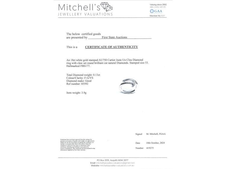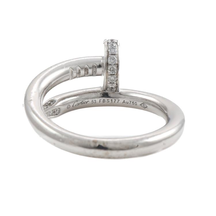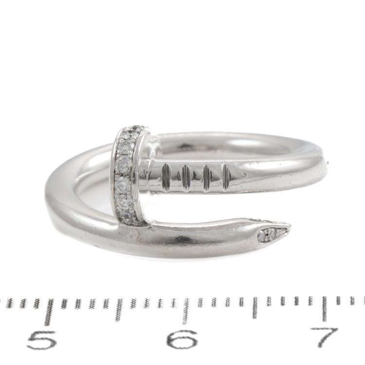 Cartier Juste Un Clou Diamond ring with 13 round Natural Diamonds of 0.13ct. 18ct white gold. Cartier stamped size 53, N1/2 - ring resizing is not recommended. Band width: 2.65mm. Weight: 3.9g. With Certificate #419275 (Pre-owned)