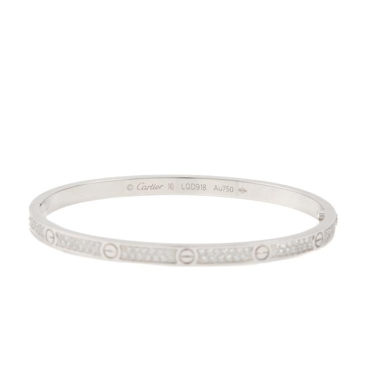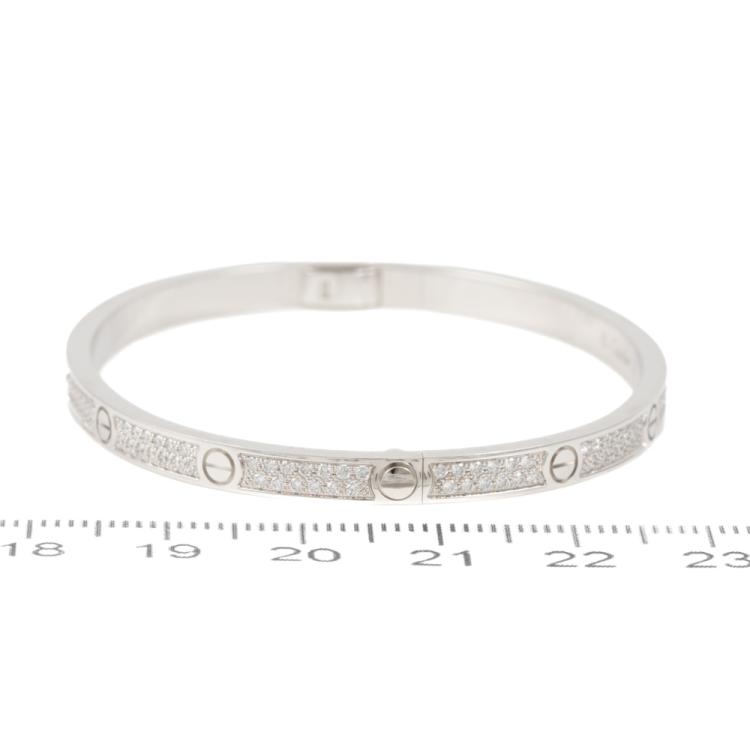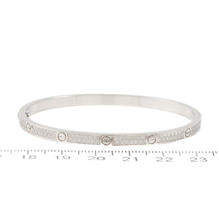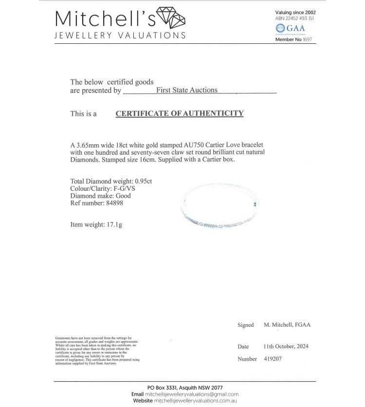 Cartier Love bracelet with 177 round Diamonds totalling 0.95cts (Estimated grading: F VS). 18ct white gold. Cartier stamped size 16cm. Width: 3.65mm. Weight: 17.1g. With Cartier box and Cartier screwdriver. With certificate #419207. (Pre-owned)