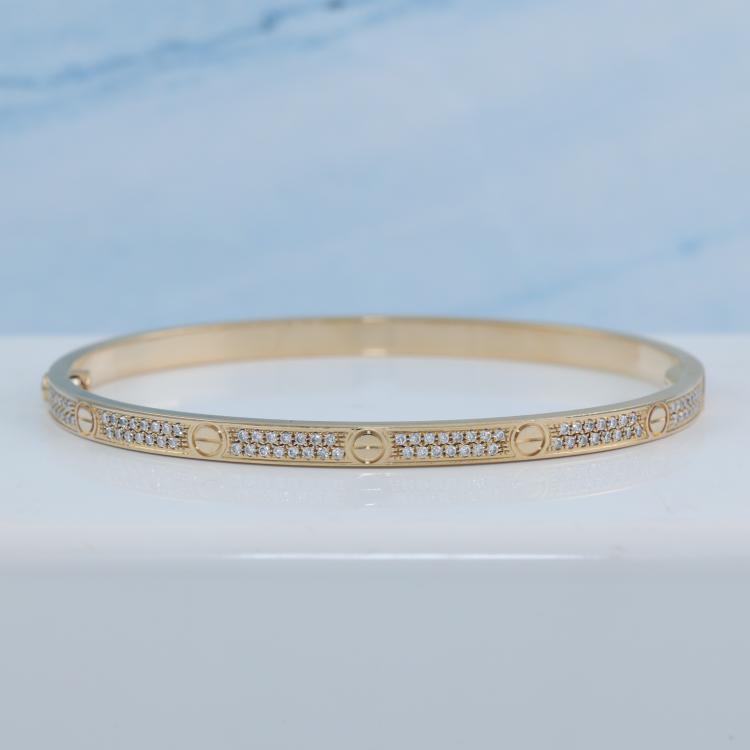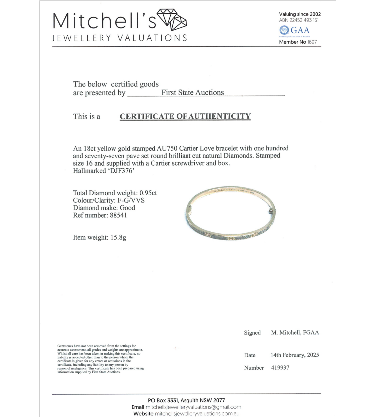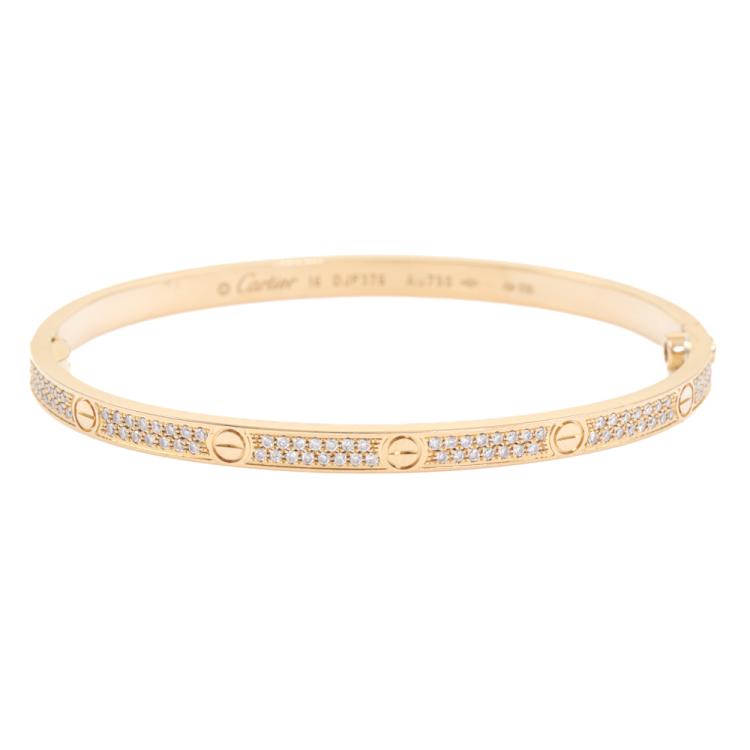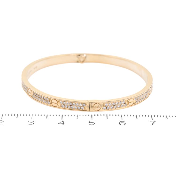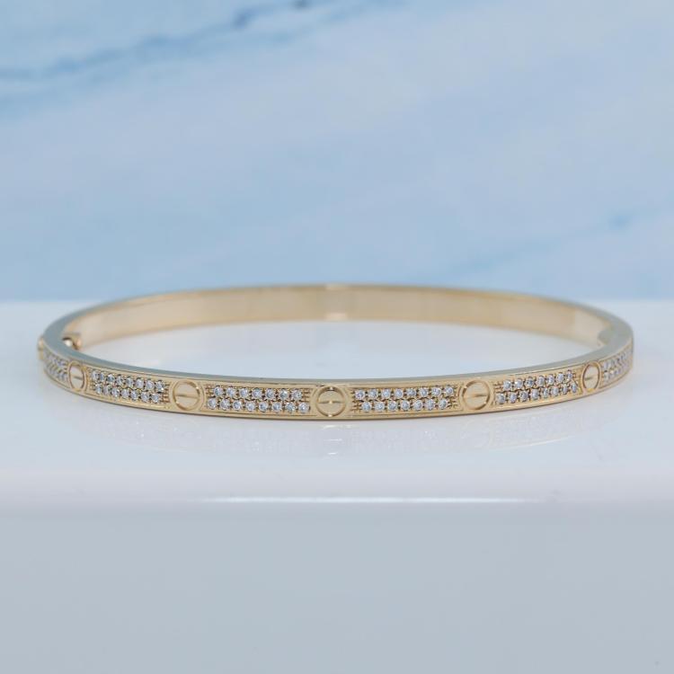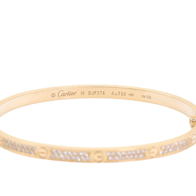 Cartier Love bracelet, small model with 177 pave set round Natural Diamonds totalling 0.95ct (Estimated grading: F-G VVS). 18ct yellow gold. Cartier stamped size 16cm. Width: 3.65mm. With Cartier screwdriver inside Cartier box. Weight: 15.8g. With certificate #419937. (Pre-owned)