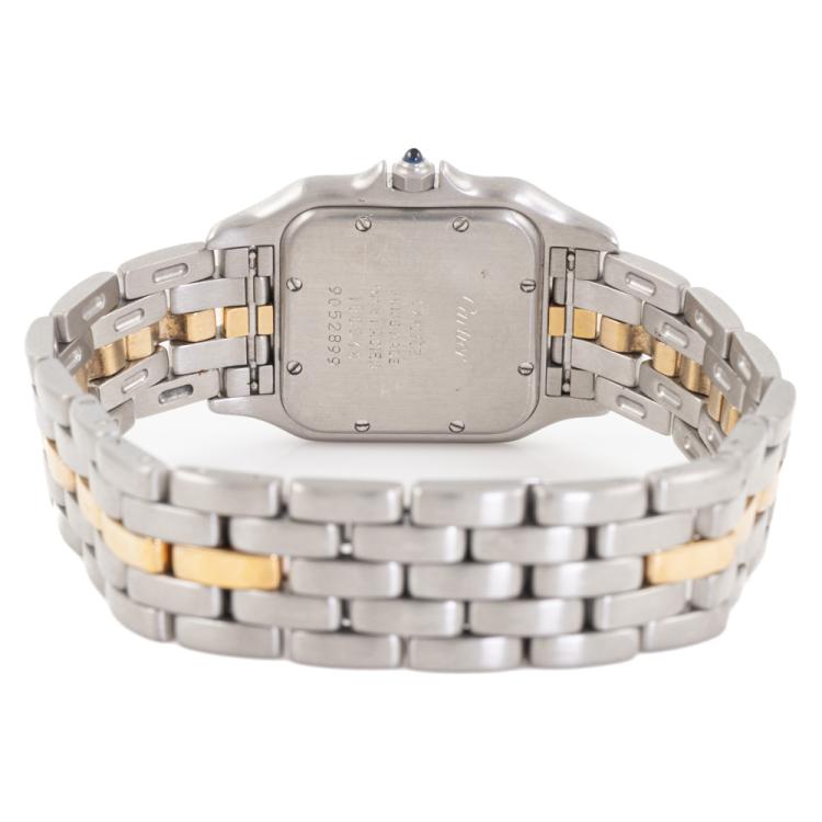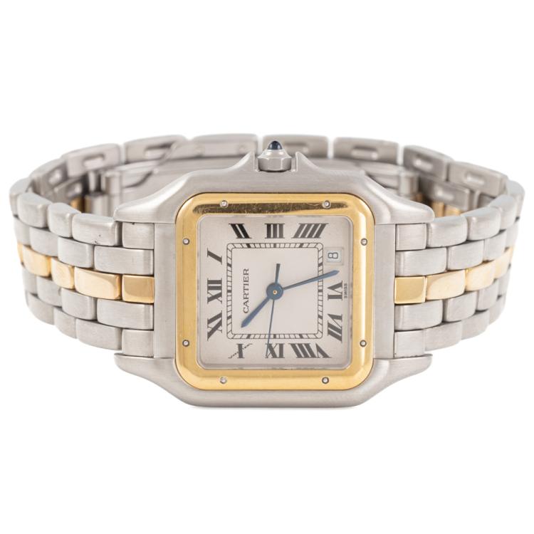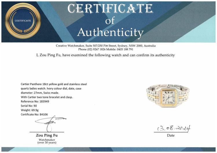Cartier Panthere 18ct yellow gold and stainless steel quartz ladies watch. Ivory colour dial, date, case diameter: 27mm, wrist size: 16.5cm, Swiss made. Ref# 183949. With Cartier two tone bracelet and clasp. With Certificate of Authenticity, Cartier Certificate International Guarantee Certificate dated 22/09/1991 and Cartier box. 3 month FSA warranty. (Pre-owned)