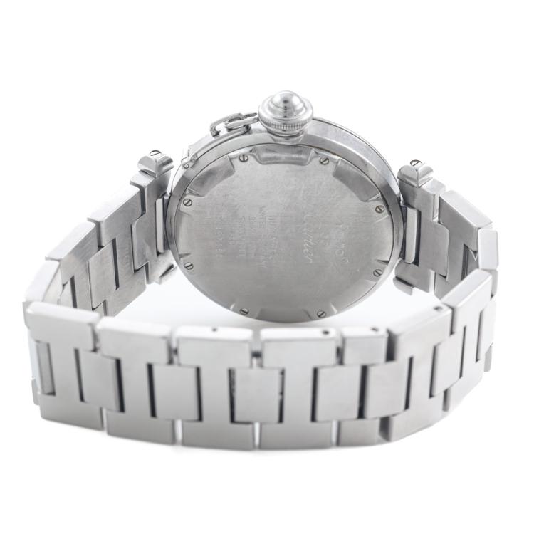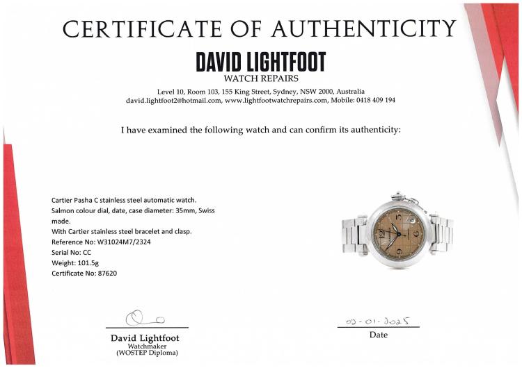 Cartier Pasha C stainless steel automatic watch. Salmon colour dial, date, case diameter: 35mm, wrist size: 15.5cm, Swiss made. Ref# W31024M7/2324. With Cartier stainless steel bracelet and clasp. With Certificate of Authenticity and Cartier box with Cartier gift bag. 3 month FSA warranty. (Pre-owned)