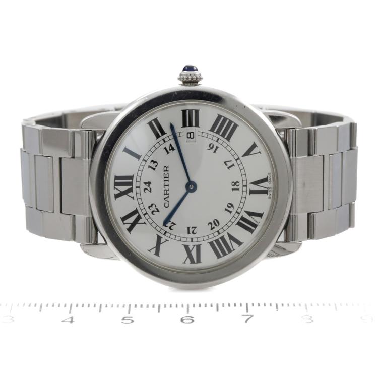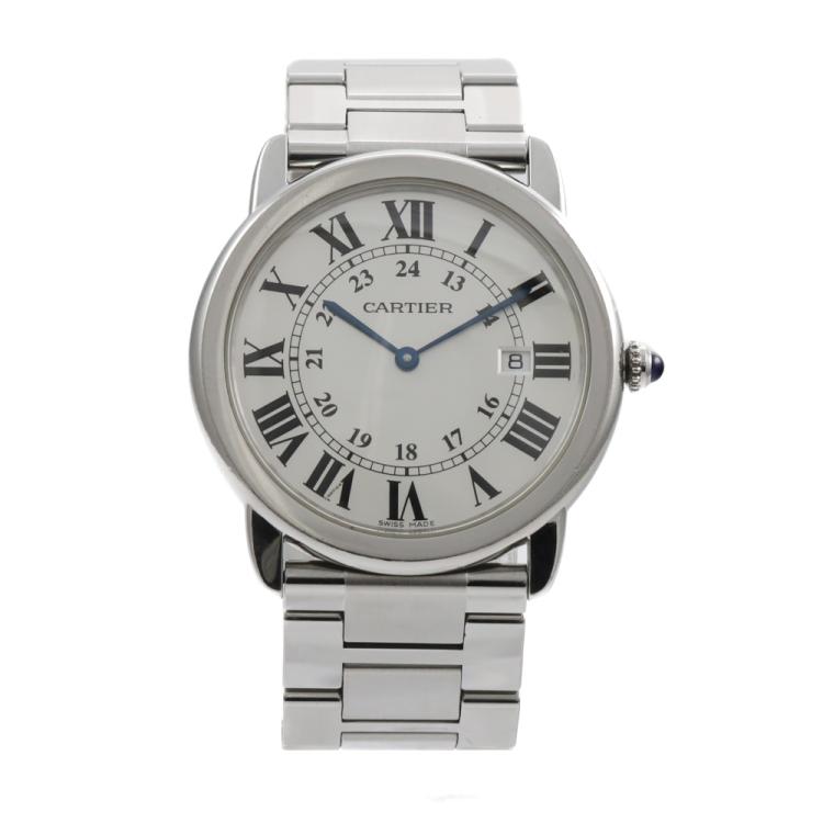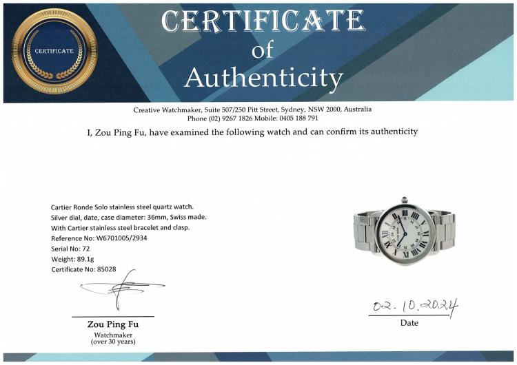 Cartier Ronde Solo stainless steel quartz watch. Silver dial, date, case diameter: 36mm, wrist size: 15.5cm, Swiss made. Ref# W6701005/2934. With Cartier stainless steel bracelet and clasp. With Certificate of Authenticity. 3 month FSA warranty (Pre-owned)