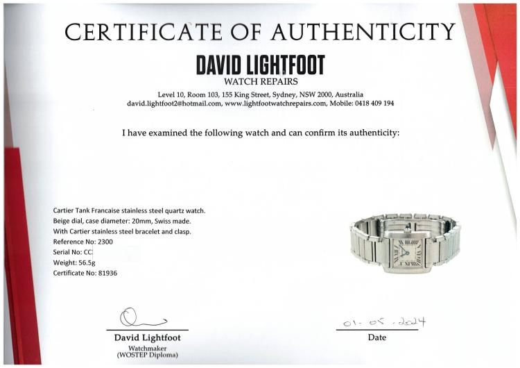 Cartier Tank Francaise stainless steel quartz watch. Beige dial, case diameter: 20mm, wrist size: 15cm, Swiss made. Ref# 2300. With Cartier stainless steel bracelet and clasp. With Certificate of Authenticity and Cartier box. 3 month FSA warranty (Pre- Owned)