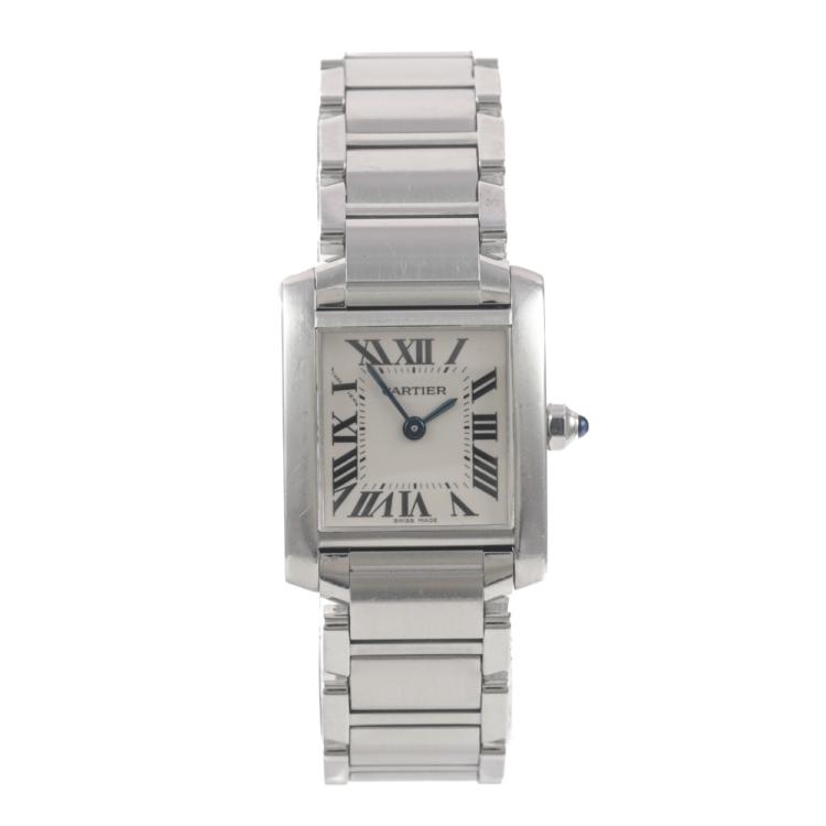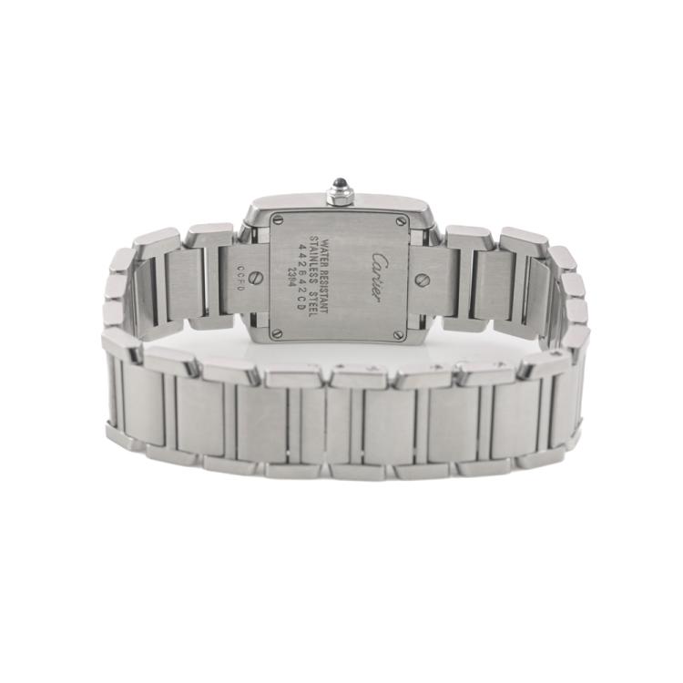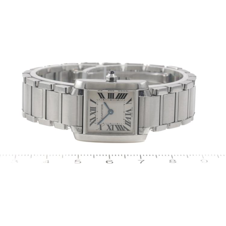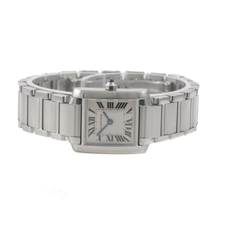 Cartier Tank Francaise small model stainless steel quartz ladies watch. Ivory dial, case diameter: 25mm x 20mm, wrist size: 16cm, Swiss made. Ref# W51008Q3/2384. With Cartier stainless steel bracelet and clasp. With Certificate of Authenticity, Undated Cartier Certificate booklet and Cartier box. 3 month FSA warranty (Pre-owned)