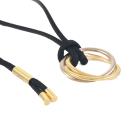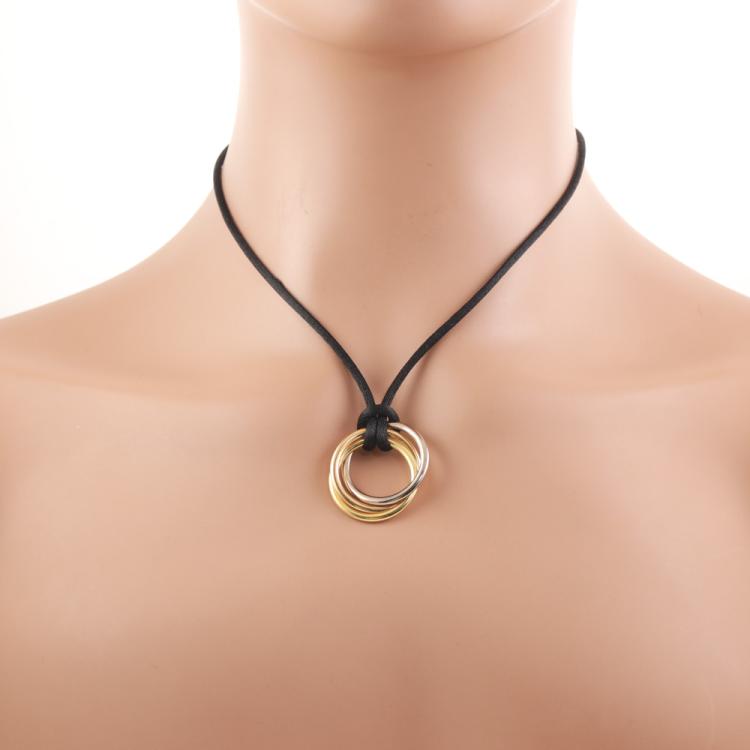 Cartier Trinity necklace. Motif inner diameter: 18.5mm. 18ct yellow, rose & white gold with 57.0cm black cord. Weight: 13.4g. (Pre-owned)