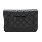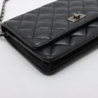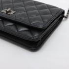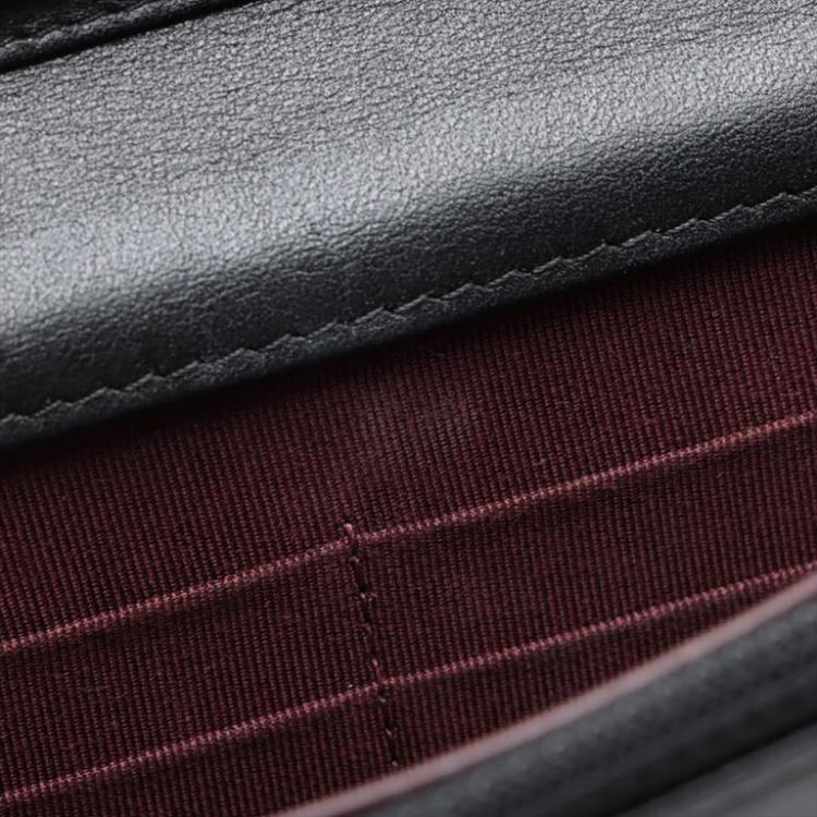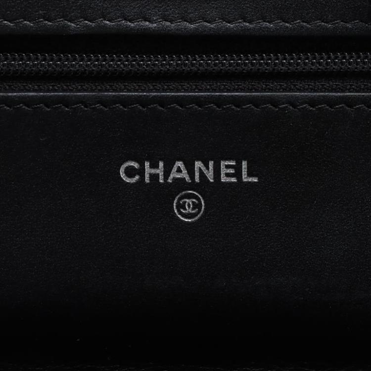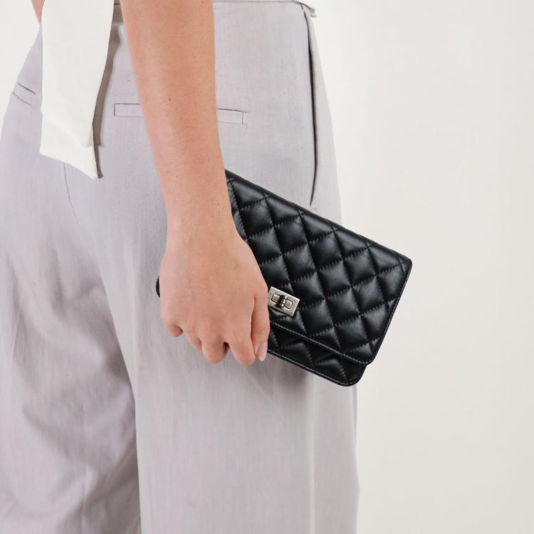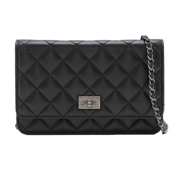 Chanel 2.55 Wallet on Chain in black, diamond quilted Aged-calfskin leather (#25xxxxxx). Featuring Aged silver-tone hardware, chain link leather threaded shoulder strap, full frontal flap with Chanel 2.55 turn lock. This opens to a burgundy fabric lining interior with zipper and patched pockets and card slots. Approx. dimensions: 20cm(W) x 12.5cm(H) x 4.5cm(D), and 61cm shoulder height. Accompanied by a Chanel box. With Entrupy Certificate of Authenticity. (Pre-owned)