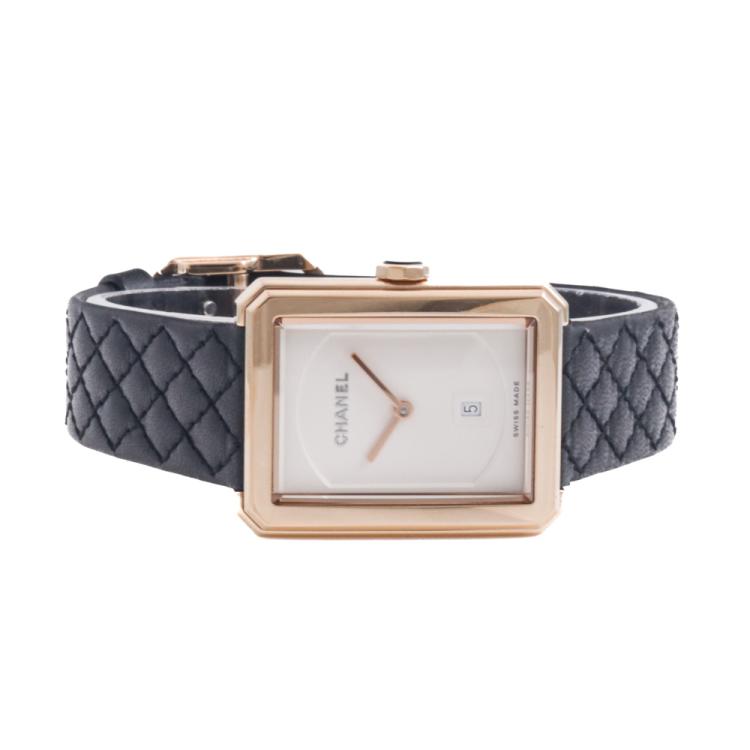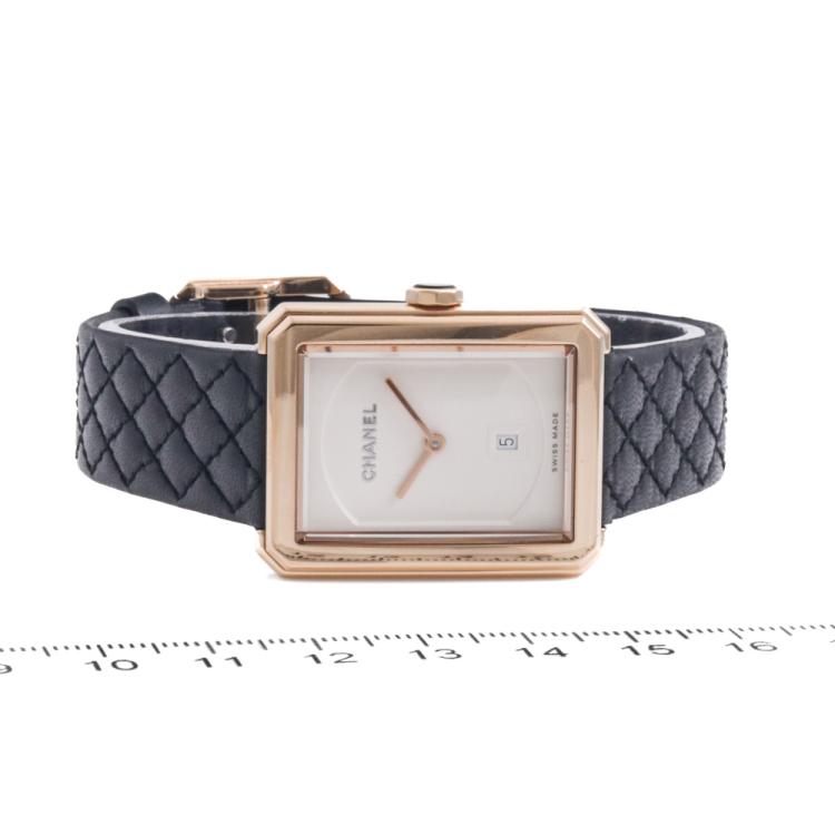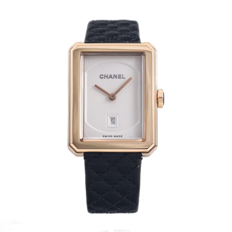 Chanel Boy-Friend Medium version 18ct Beige gold quartz ladies watch. Opaline guilloché dial, date, case diameter: 34.6mm x 26.7mm, strap length: 17.5cm, Swiss made. Ref# H6588. With Chanel black quilted pattern calfskin strap and 18ct gold buckle. With Certificate of Authenticity, Chanel International Warranty card dated 13/02/2021, Chanel Repair Guarantee booklet dated 10/03/2023 and Chanel box. With 2 spare Chanel straps. 3 month FSA warranty. (Pre-owned)