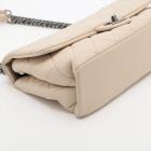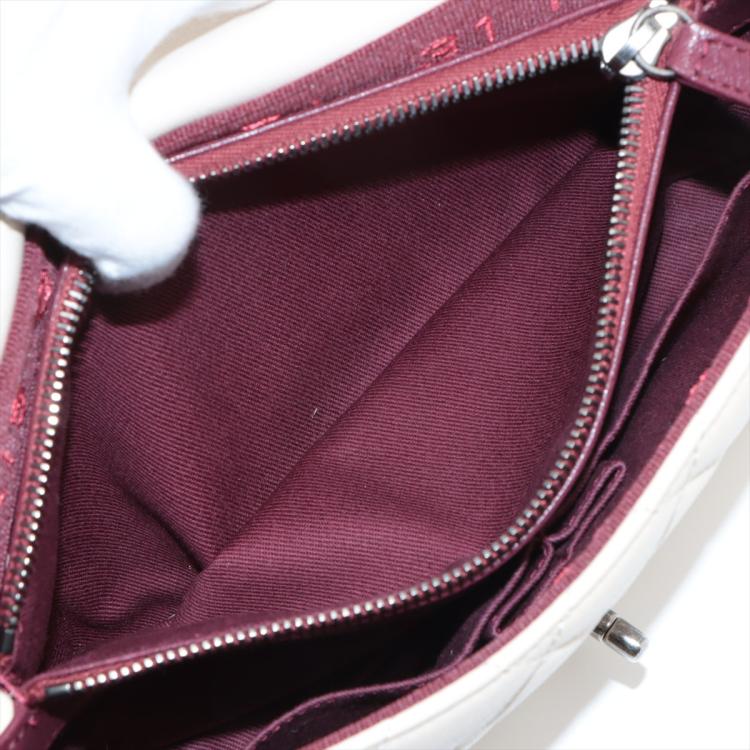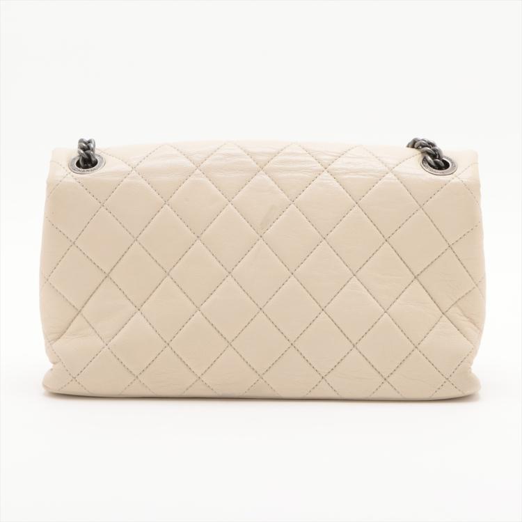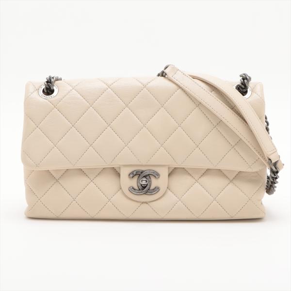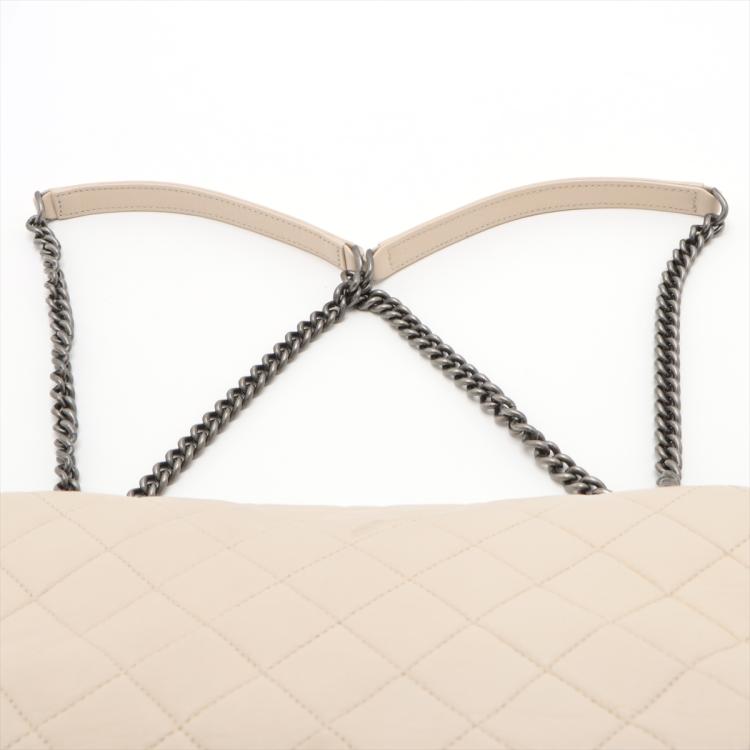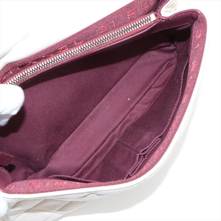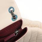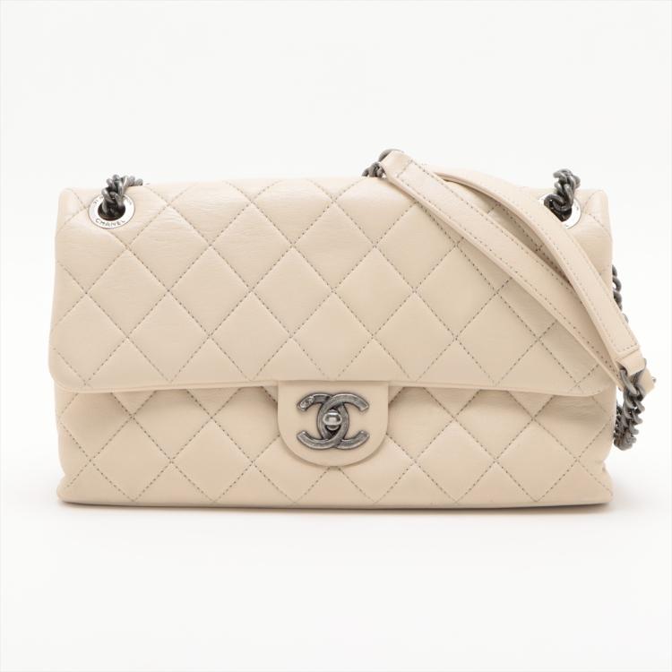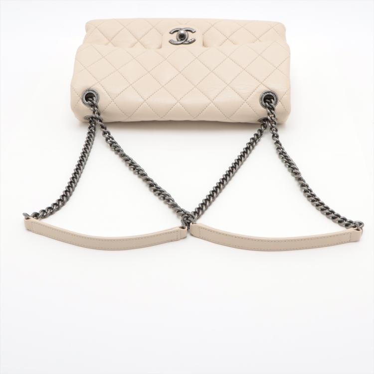 Chanel Burgundy Rocks flap bag in light beige diamond-quilted lambskin leather (20xxxxxx). Featuring antique metal-toned hardware, and double chain straps with leather shoulder pads. The front flap with CC turn-lock closure opens to a burgundy textile interior with two compartments with patch pockets, divided by a zip pocket. Approximate dimensions: 27cm(L) x 15cm(H) x 7cm(D), double strap drop 26cm. With Entrupy Certificate of Authenticity. (Pre-owned)