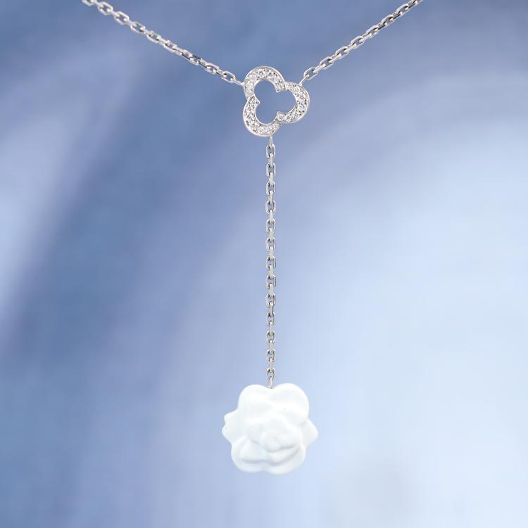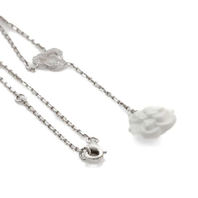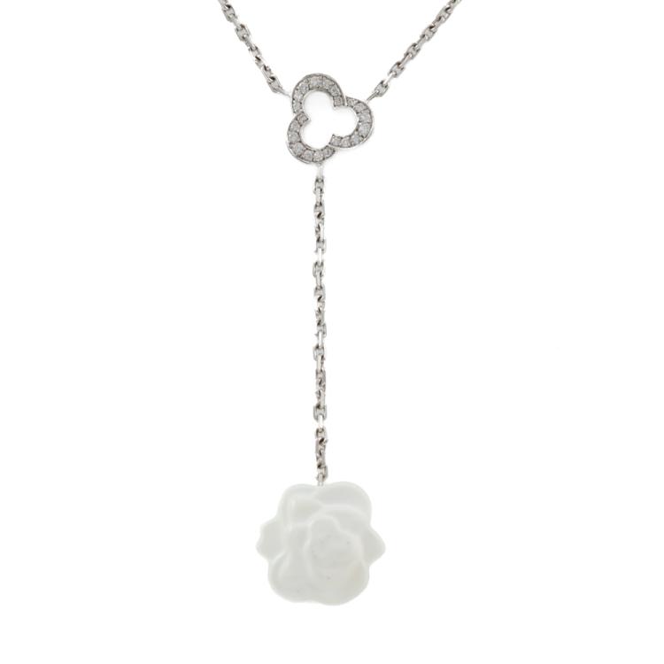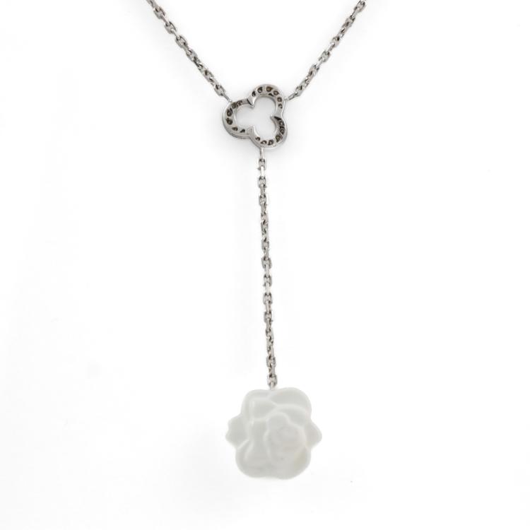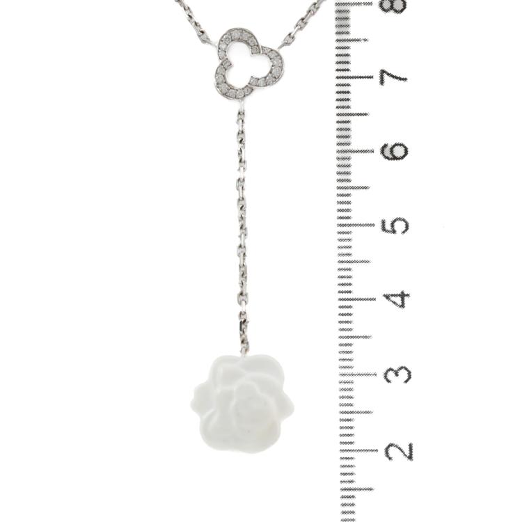Chanel Camelia necklace with a white Chalcedony flower and round Natural Diamonds totalling approximately 0.10ct. 18ct white gold with attached 41cm Chanel chain. Motif size: 13.7mm - 13.3mm. Weight: 6.2g. With Chanel box and Chanel Certificate dated 12/02/16. (Pre-owned)