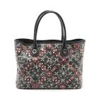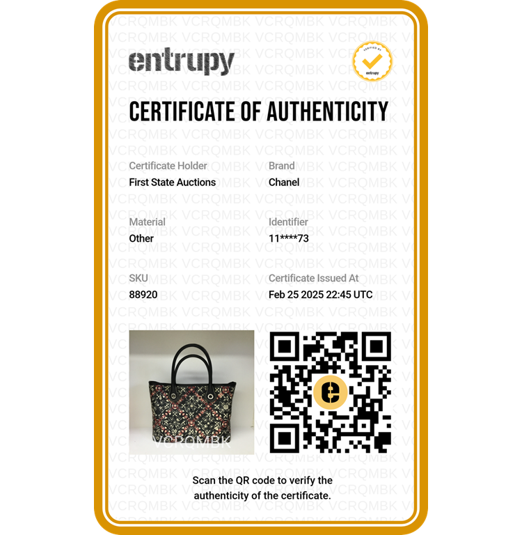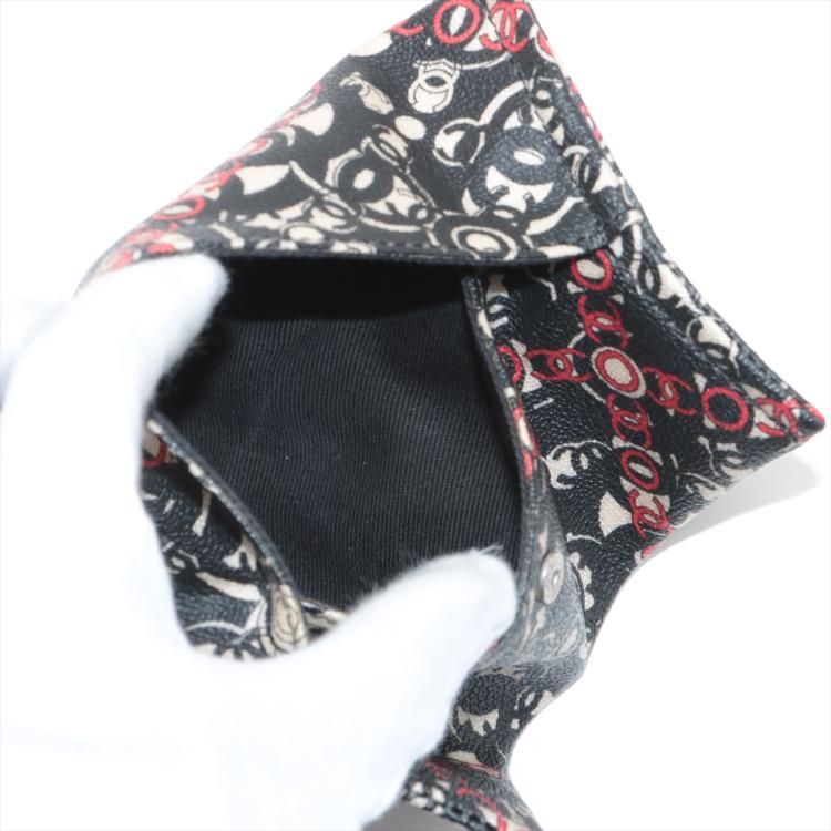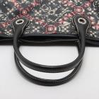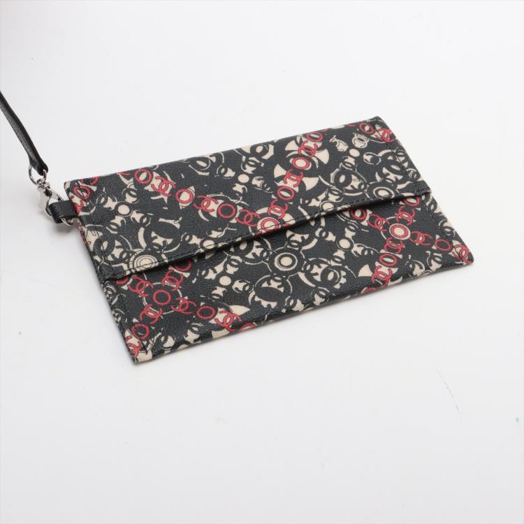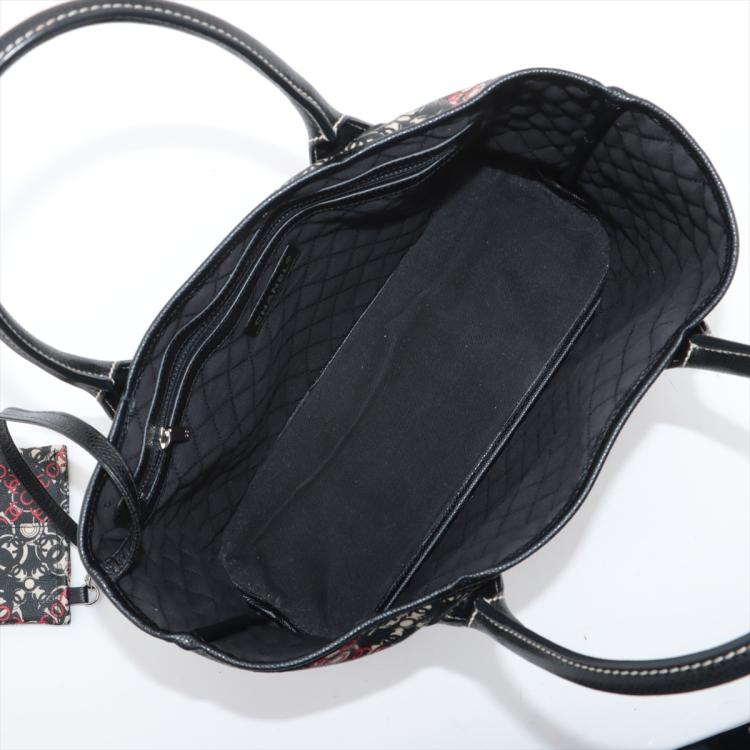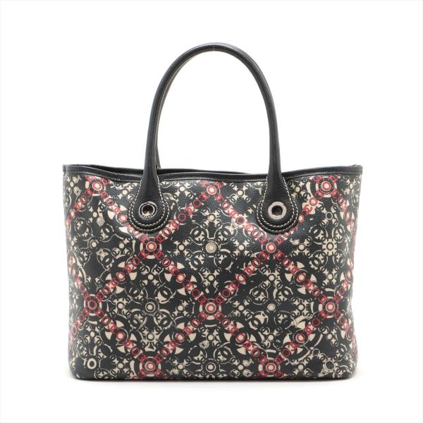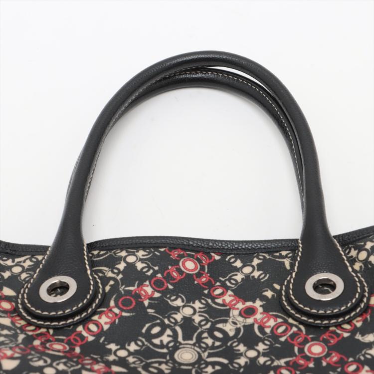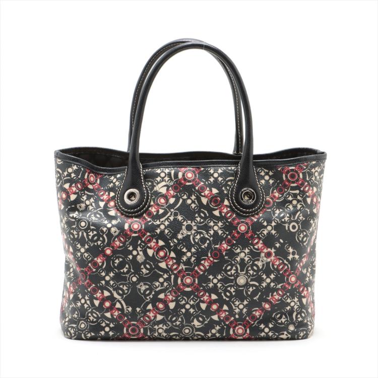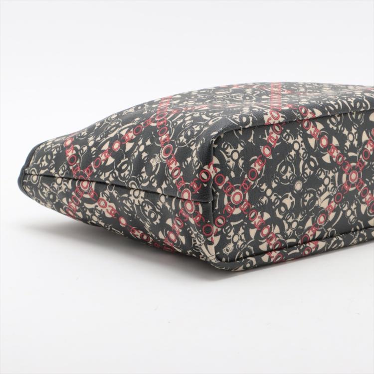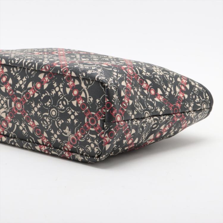 Chanel Coco small tote in black, red, and white design coated PVC canvas, and black textured leather trim and handles (11xxxxxx). Featuring silver-toned hardware, dual rolled tall handles, and a detached matching pouch. The top opens to a black textile interior with a zipper pocket. Approximate dimensions: 33cm(L) x 25cm(H) x 11cm(D), handle drop 15cm. Accompanied by Chanel dustbag and authentication card. With Entrupy Certificate of Authenticity. (Pre-owned)