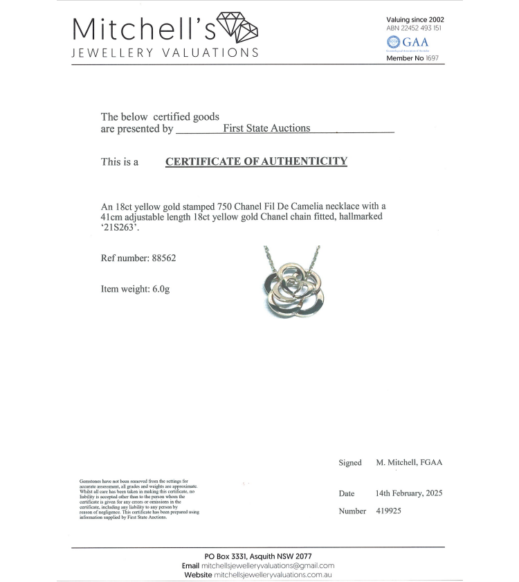 Chanel Fil De Camelia necklace. Motif size: 17.5mm x 19mm. 18ct yellow gold with Chanel 41cm 18ct yellow gold chain. Weight: 6.0g. With Certificate #419925. (Pre-owned)