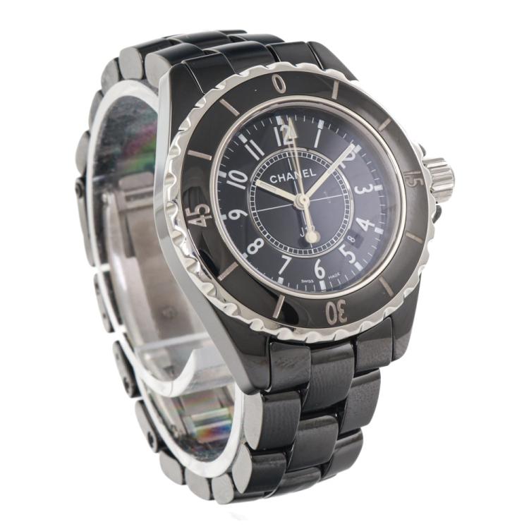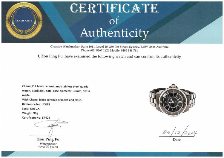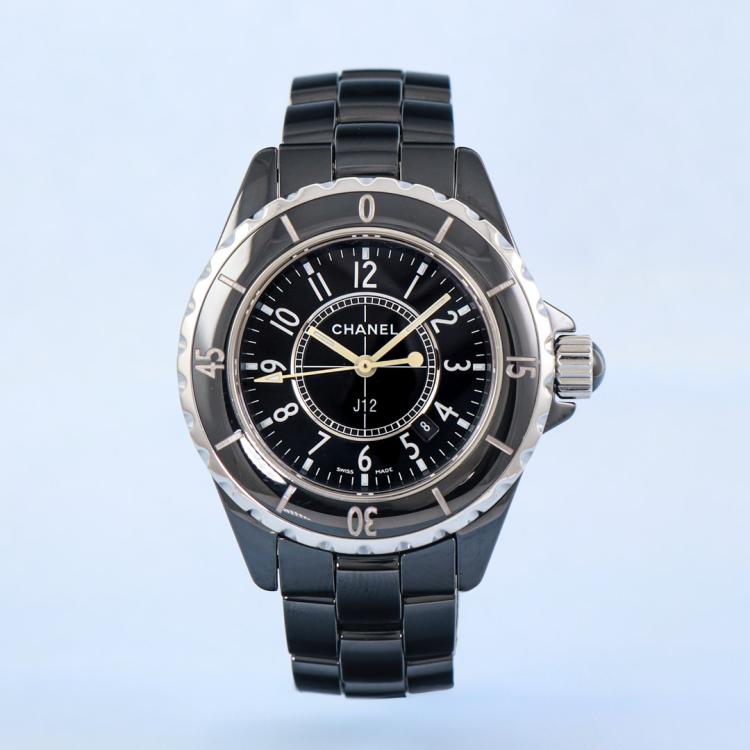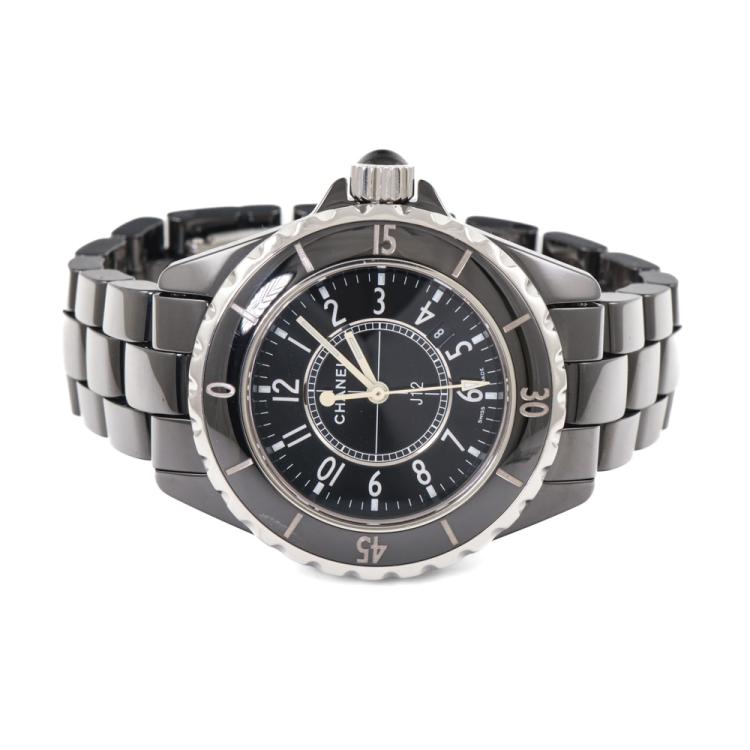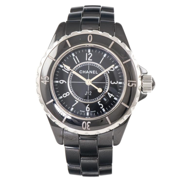 Chanel J12 black ceramic and stainless steel quartz watch. Black dial, date, case diameter: 33mm, wrist size: 15.5cm, Swiss made. Ref# H0682. With Chanel black ceramic bracelet and clasp. With Certificate of Authenticity and Chanel box. 3 month FSA warranty (Pre-owned)