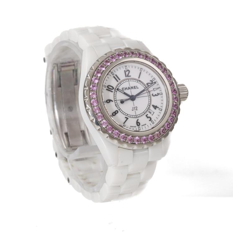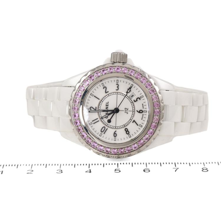 Chanel J12 ceramic quartz ladies watch. White dial, pink Sapphire set bezel, date, case diameter: 33mm, wrist size: 17cm, Swiss made. Ref #H1181. With Chanel white ceramic bracelet and clasp. With Certificate of Authenticity, Chanel International Guarantee card dated 05/2004 and Chanel box with Chanel case. 3 month FSA warranty (Pre-owned)