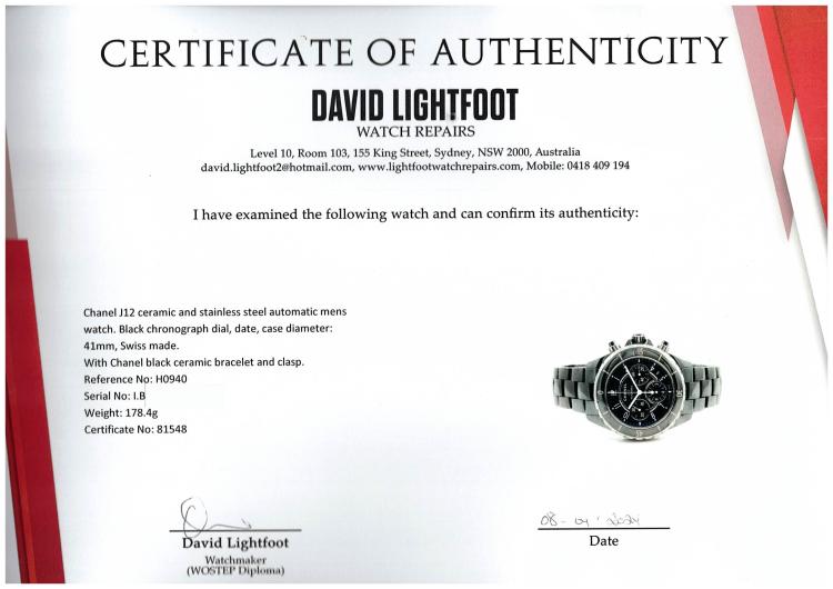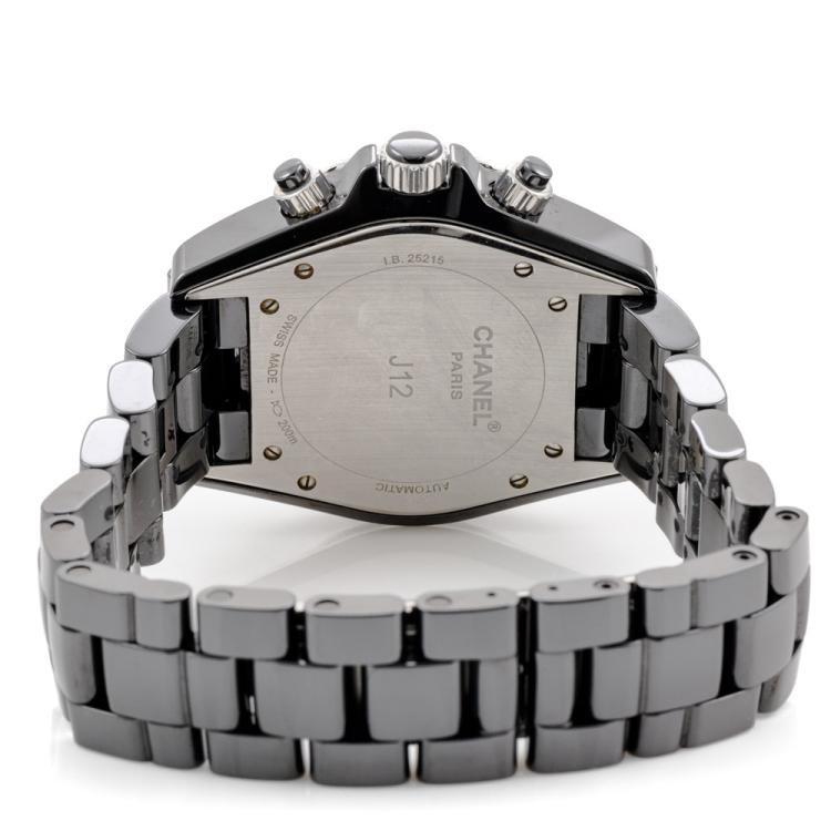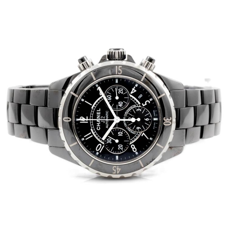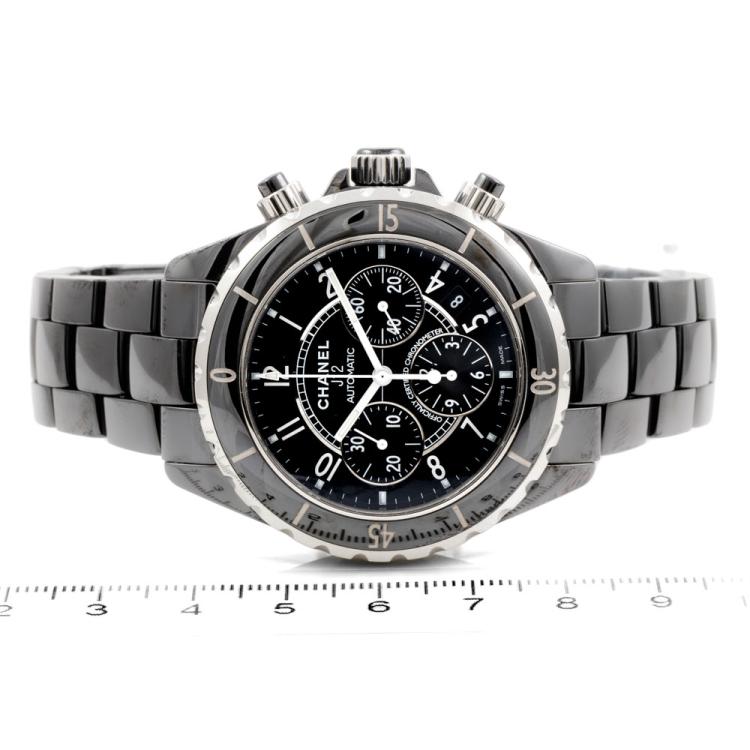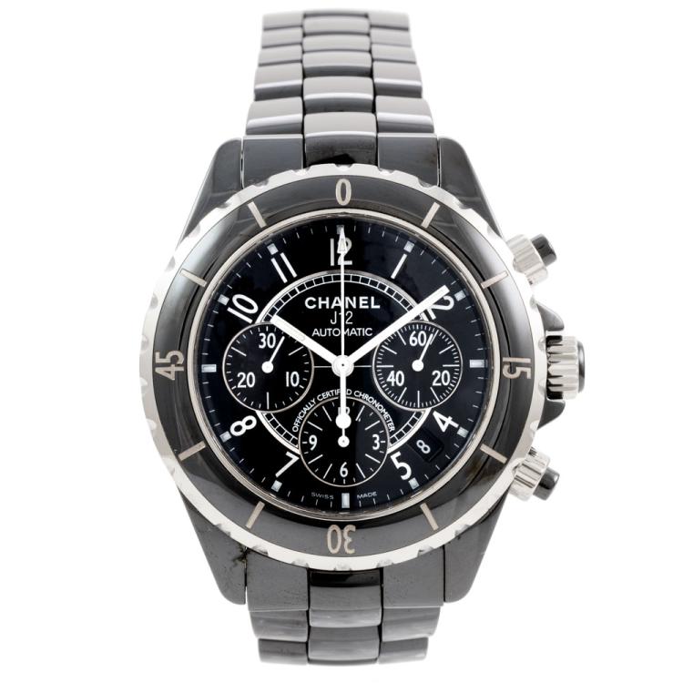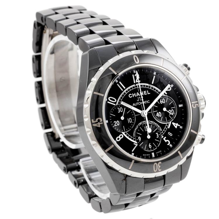 Chanel J12 ceramic and stainless steel automatic mens watch. Black chronograph dial, date, case diameter: 41mm, wrist size: 19.5cm, Swiss made. Ref# H0940. With Chanel black ceramic bracelet and clasp. With Certificate of Authenticity, Chanel International Guarantee card dated 15/08/2007 and Chanel box. 3 month FSA warranty (Pre-owned)