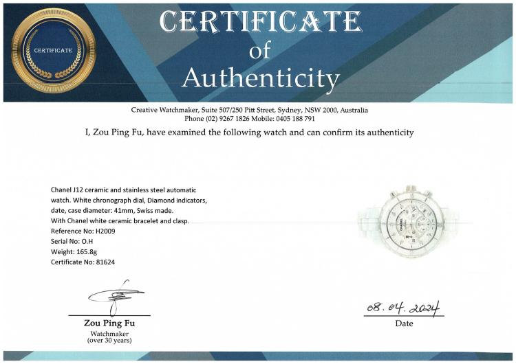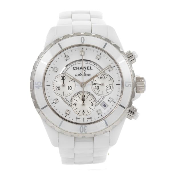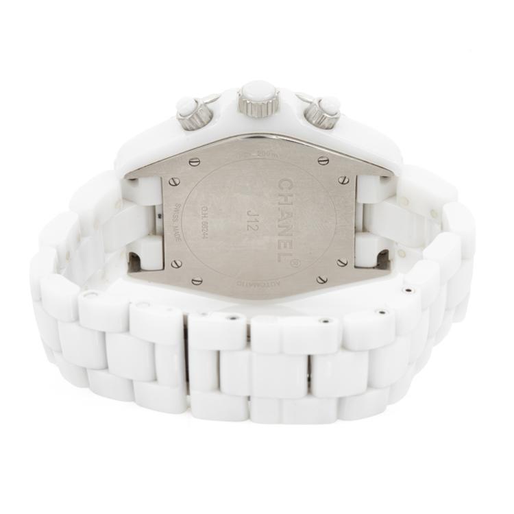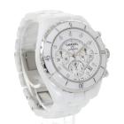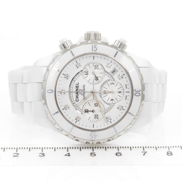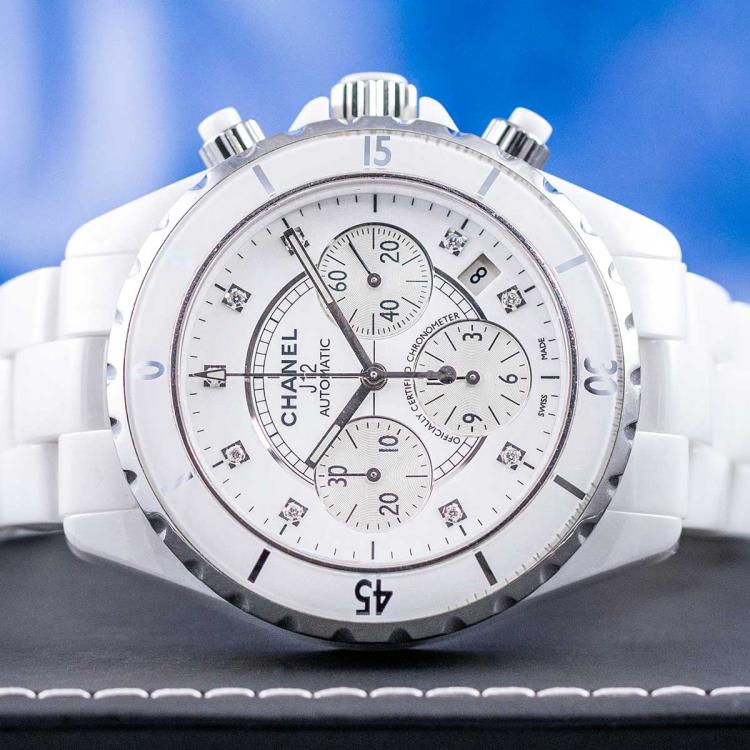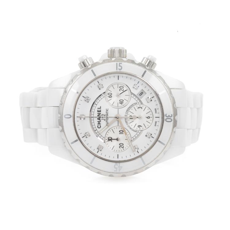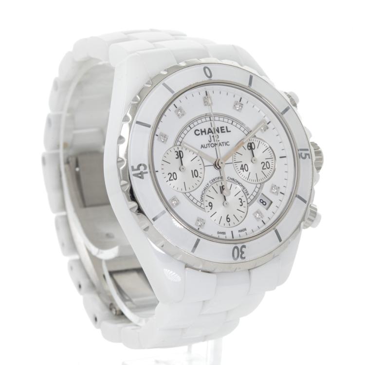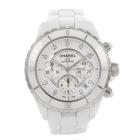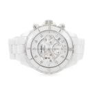 Chanel J12 ceramic and stainless steel automatic watch. White chronograph dial, Diamond indicators, date, case diameter: 41mm, wrist size: 16.5cm, Swiss made. Ref# H2009. With Chanel white ceramic bracelet and clasp. With Certificate of Authenticity. 3 month FSA warranty (Pre-owned)