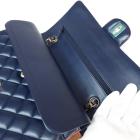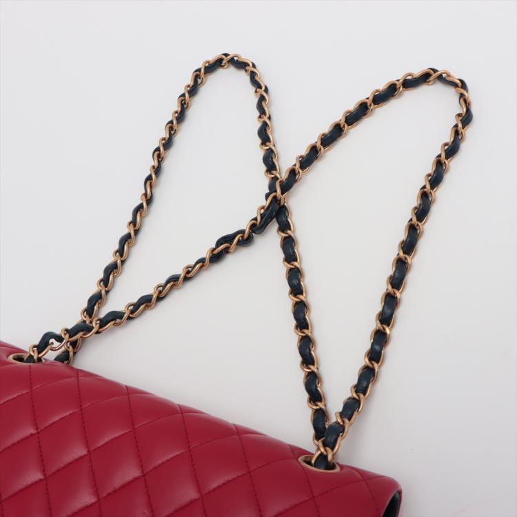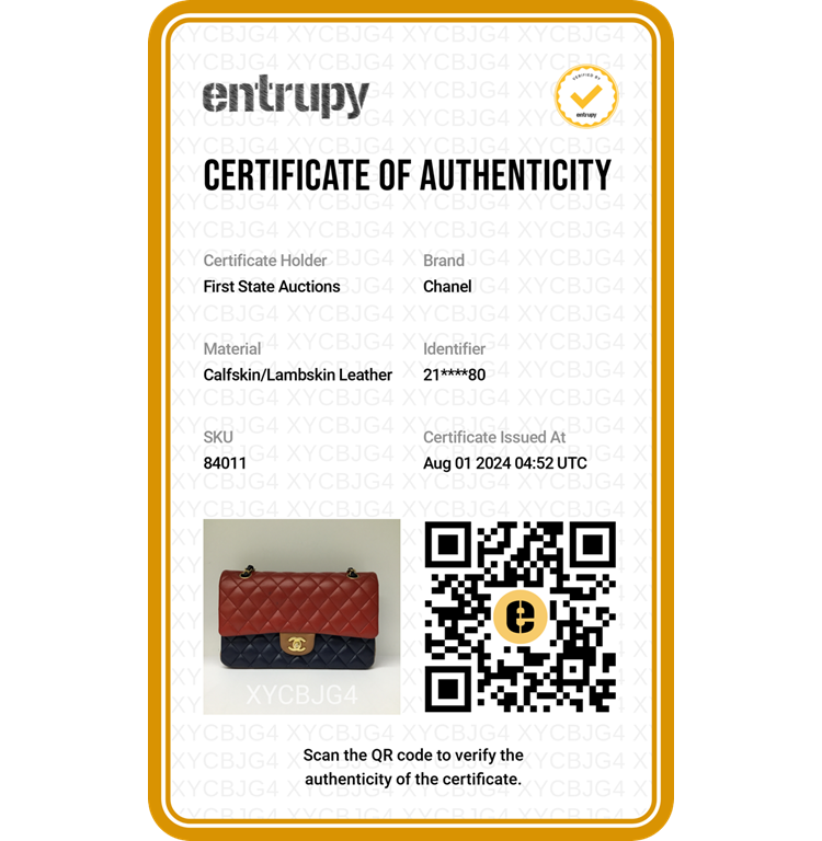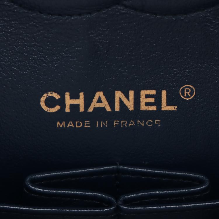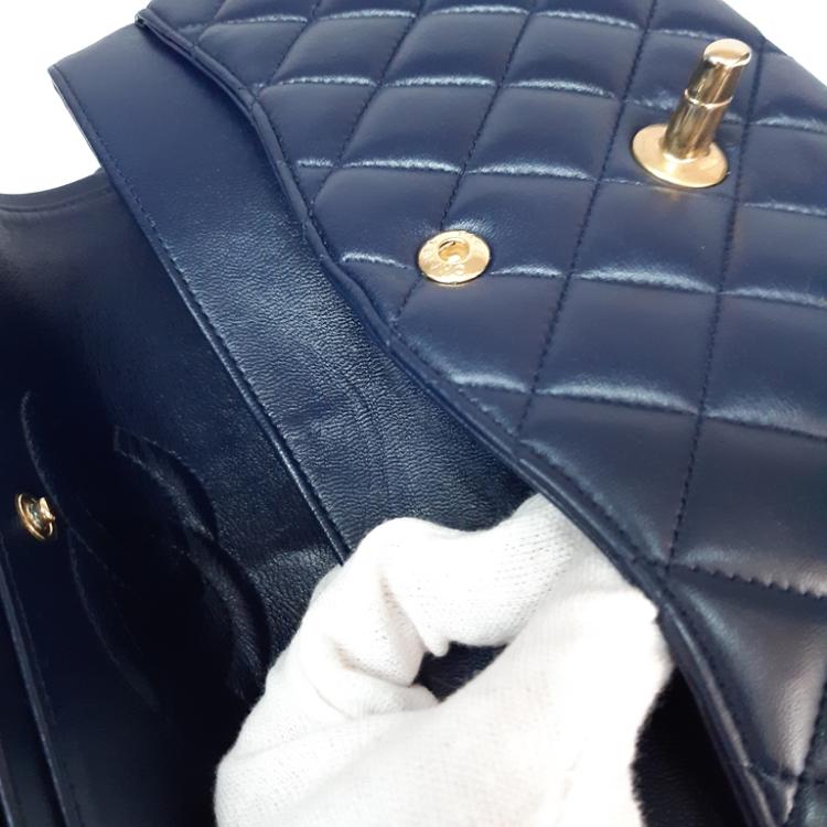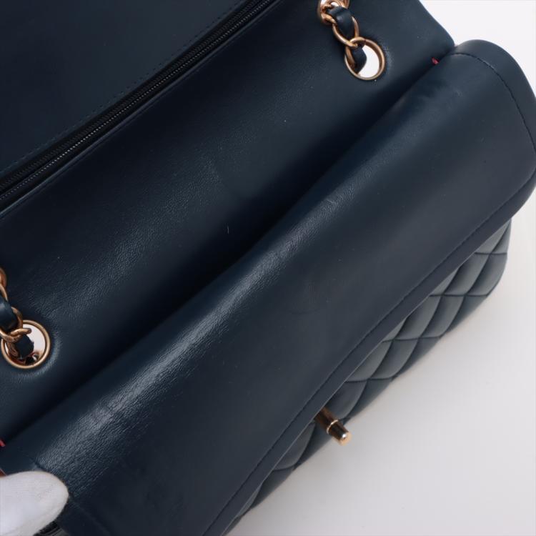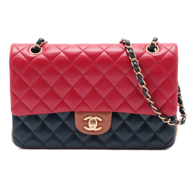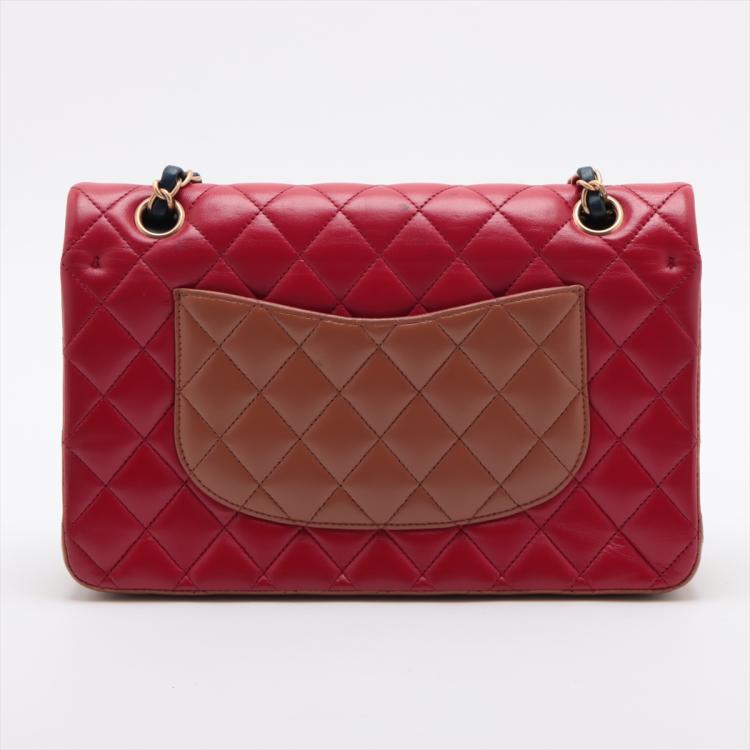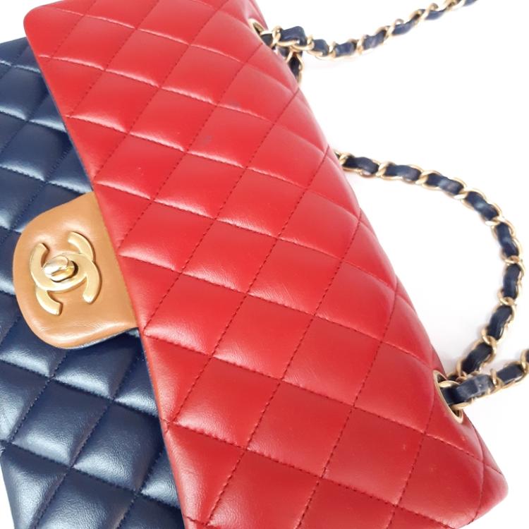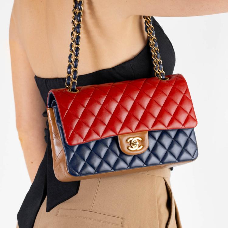 Chanel medium double flap bag in tricolour, diamond-quilted lambskin leather (serial#21xxxx80). Featuring gold-toned hardware, an exterior patch pocket at back, frontal flap with Chanel CC turn lock. This opens to reveal an inner flap & a matte navy leather interior with patch pockets. Approximate dimensions: 25cm(L) x 16m(H) x 6cm(D), shoulder double strap height 24.5cm. With Entrupy Certificate of Authenticity. (Pre-owned)