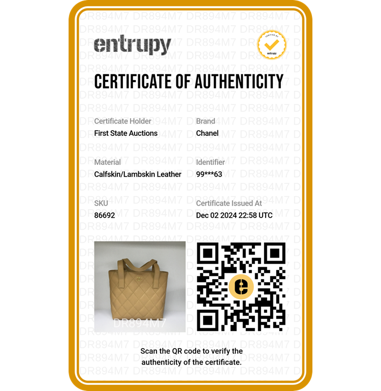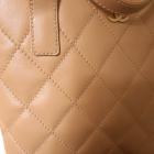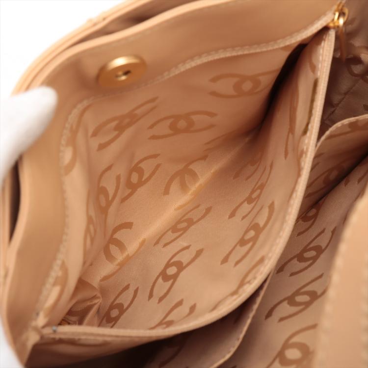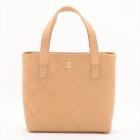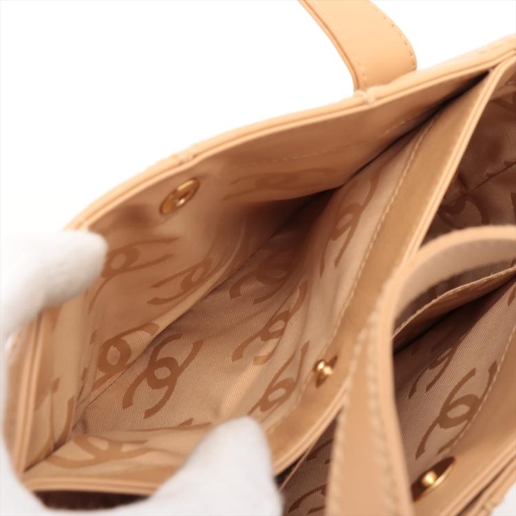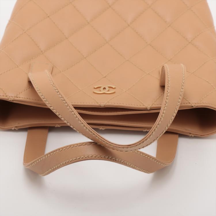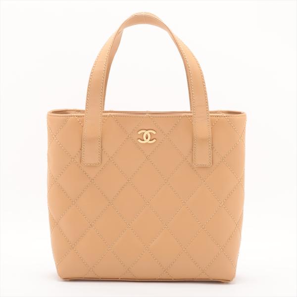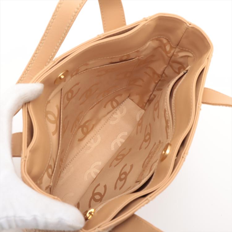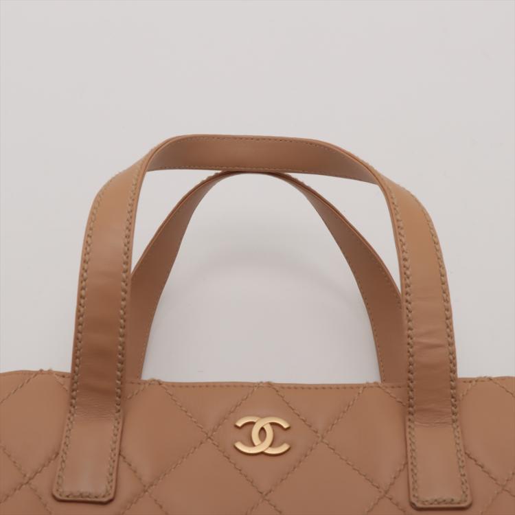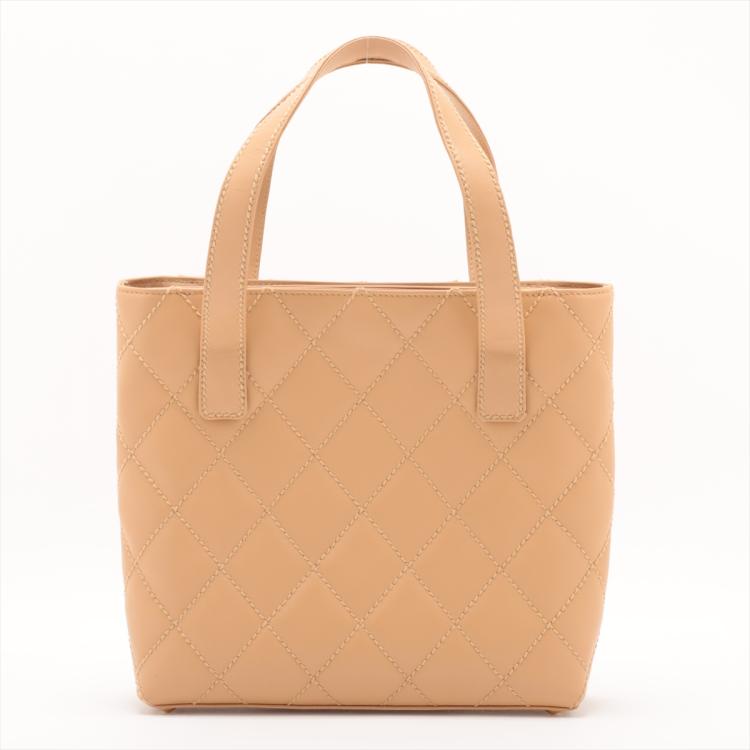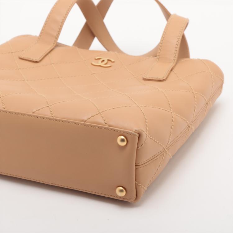 Chanel Wild Stitch tote bag in beige, diamond-quilted calfskin leather (#9xxxxxx). Featuring matt gold-tone hardware, double flat handles, CC logo detail at front, exterior pockets with snap buttons at front & rear. The magnetic button closure opens to a beige nylon logo prints lining with pockets. Approximate dimensions: 25cm(L) x 24cm(H), 7cm(D), handle drop 15cm. Accompanied by Chanel dustbag and authenticity card. With Entrupy Certificate of Authenticity. (Pre-owned)