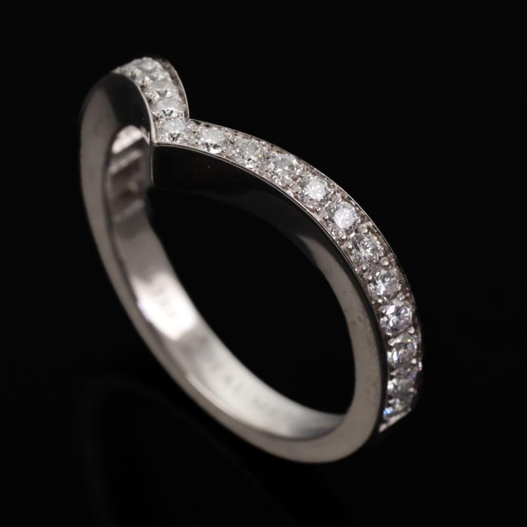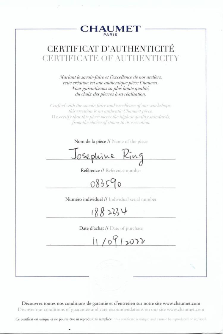 Chaumet Josephine Egret Diamond ring with round Natural Diamonds totalling approximately 0.40ct (Estimated grading: F-G VS). 18ct white gold. Ring size J - ring resizing is not recommended. Width: 2.5mm. Weight: 3.7g. With Chaumet Certificate of Authenticity dated 11/09/2022 and Chaumet box. (Pre-owned)