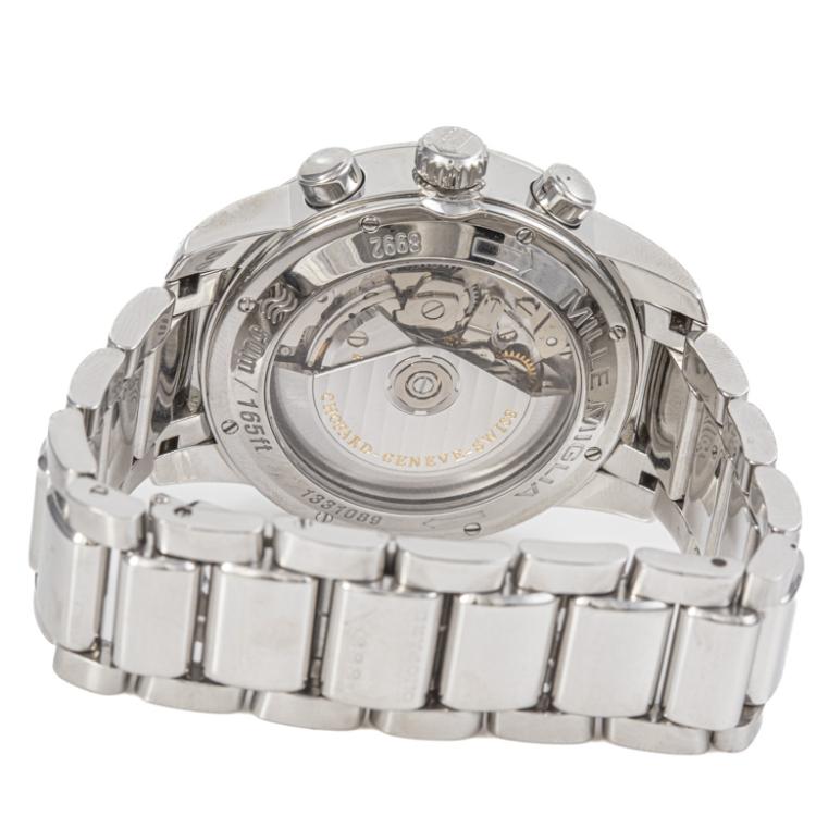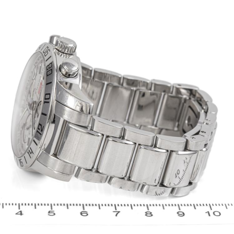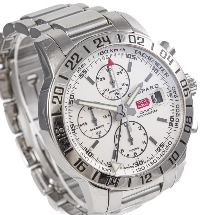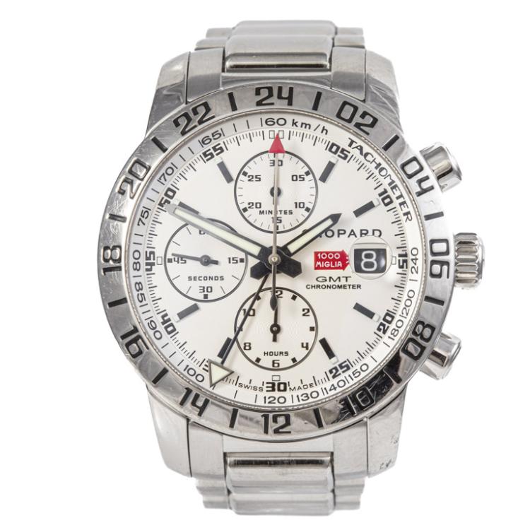 Chopard Mille Miglia GMT stainless steel automatic mens watch. Silver chronograph dial, date, case diameter: 42mm, wrist size: 17cm, Swiss made. Ref# 8992. With Chopard stainless steel bracelet and clasp. With Certificate of Authenticity. 3 month FSA warranty. (Pre-owned)