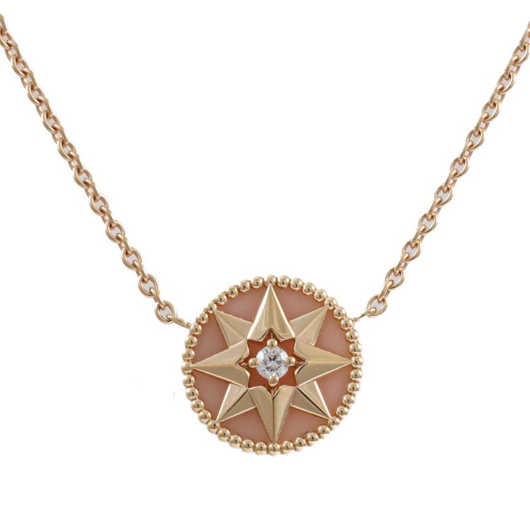 Christian Dior Rose des Vents Necklace with Diamond and pink opal. One round Natural diamond totalling 0.04ct. Motif diameter: 12mm. 18ct rose gold attached with Christian Dior 18ct rose gold chain. Maximum length: 42.5cm. Weight: 4.2g. With Christian Dior Certificated dated 12/04/2021 (Pre-owned)