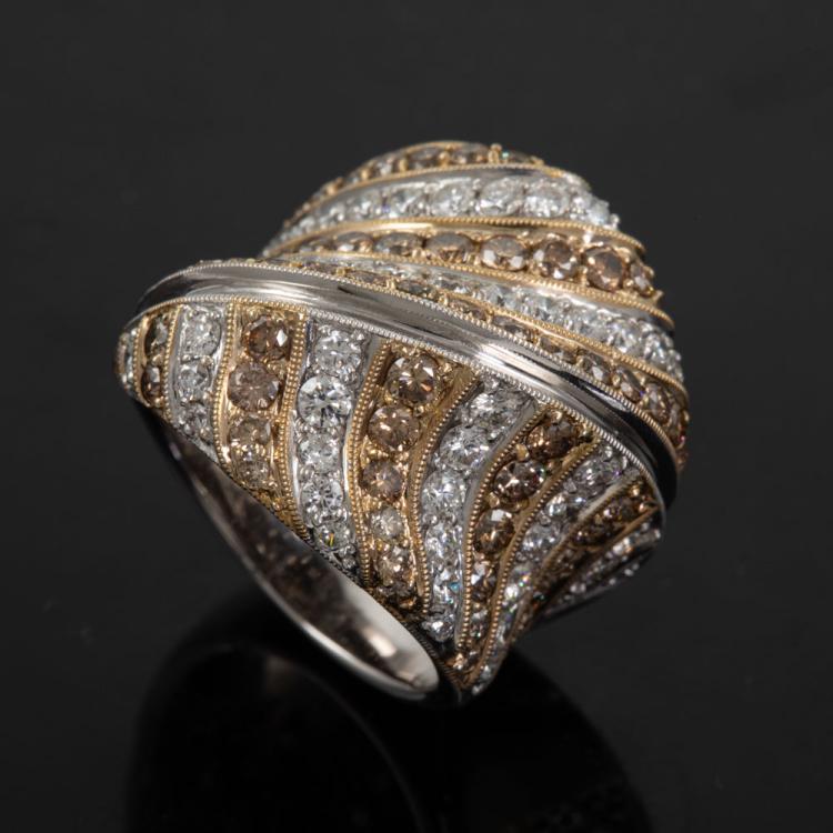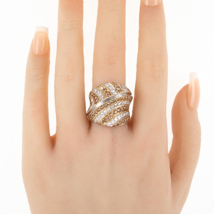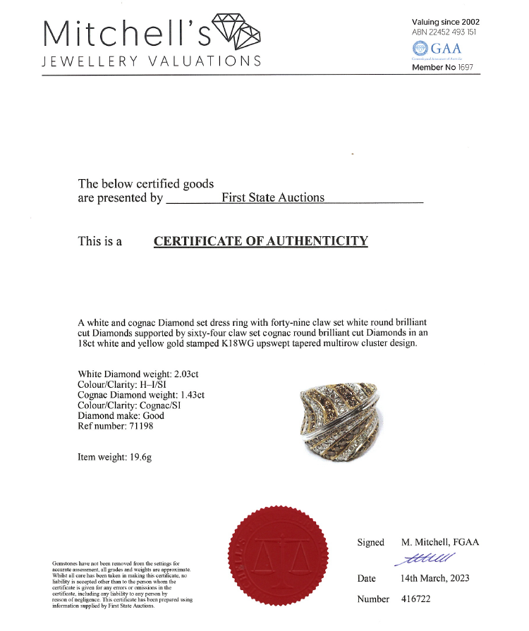 Diamond Dress ring with round Cognac Natural Diamonds totalling 1.43ct (Estimated grading: Cognac SI) and round white Natural Diamonds totalling 2.03ct (Estimated grading H-I SI). 18ct yellow and white gold. Ring size N1/2 - ring resizing is not recommended. Weight: 19.6g. With certificate #416722. (Pre-owned)