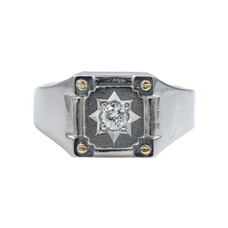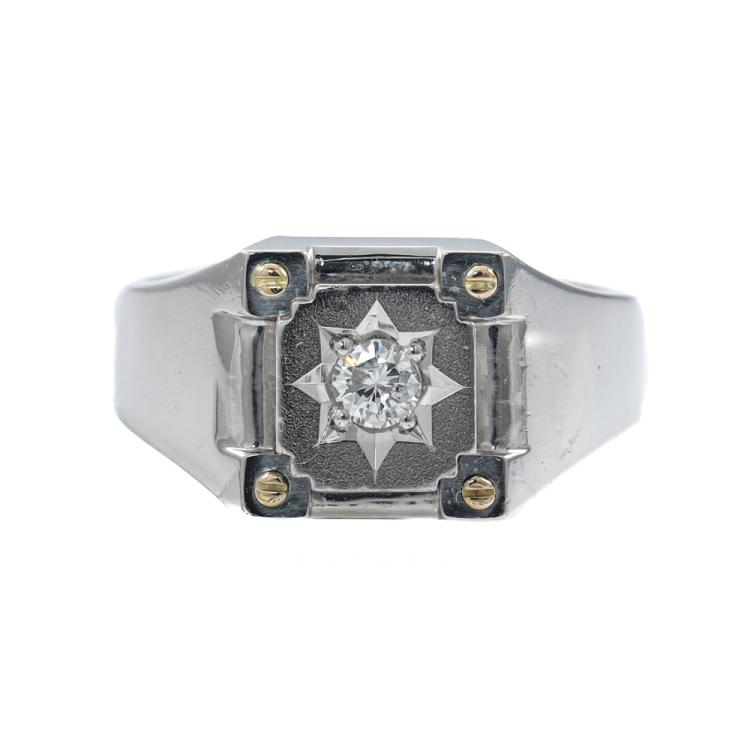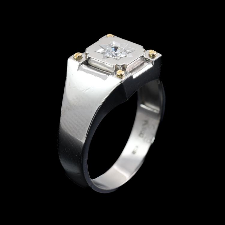 Diamond mens ring with a centre round Natural Diamond of 0.13ct. Platinum - 900 and 18ct yellow gold. Ring size: M1/2. Band width: 4mm - 5mm. Weight: 8.4g. (Pre-owed)