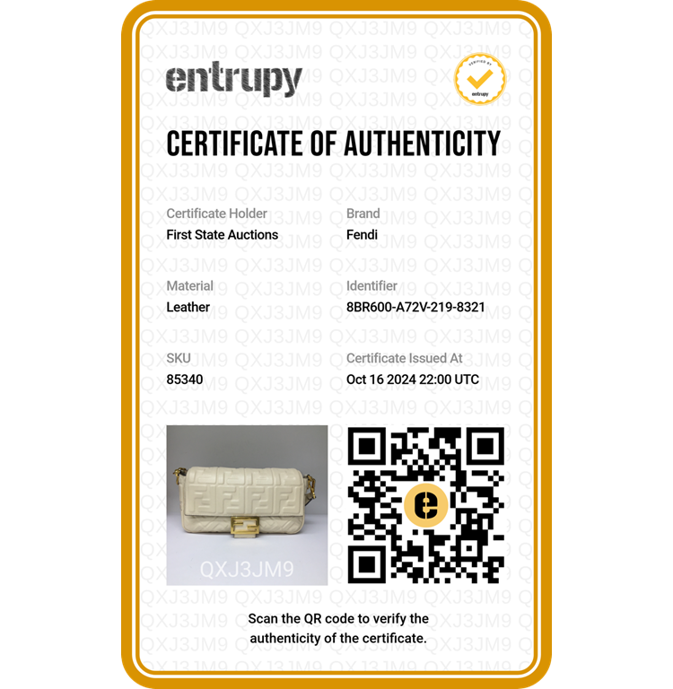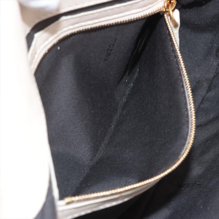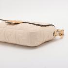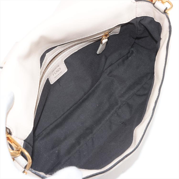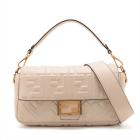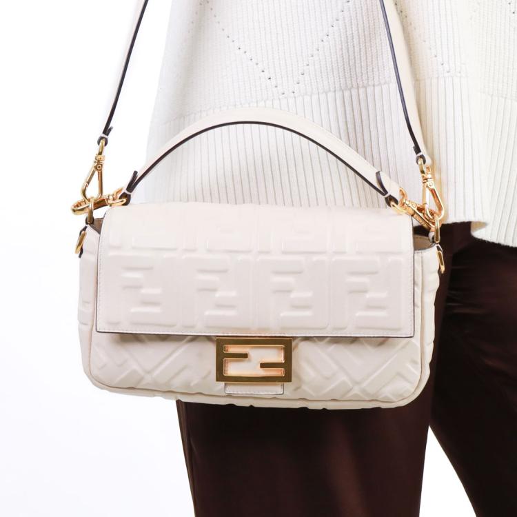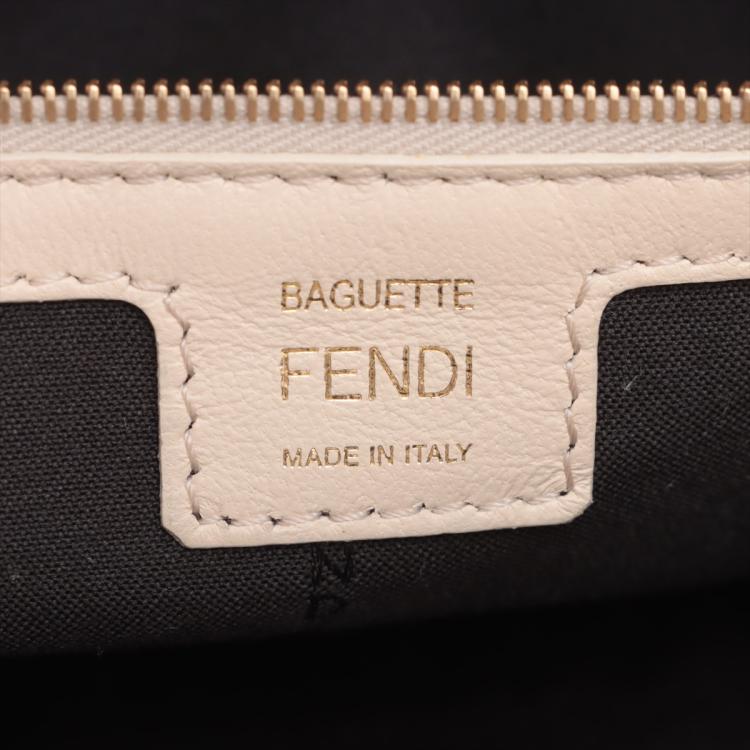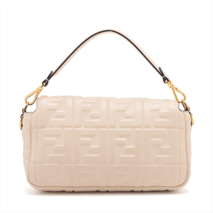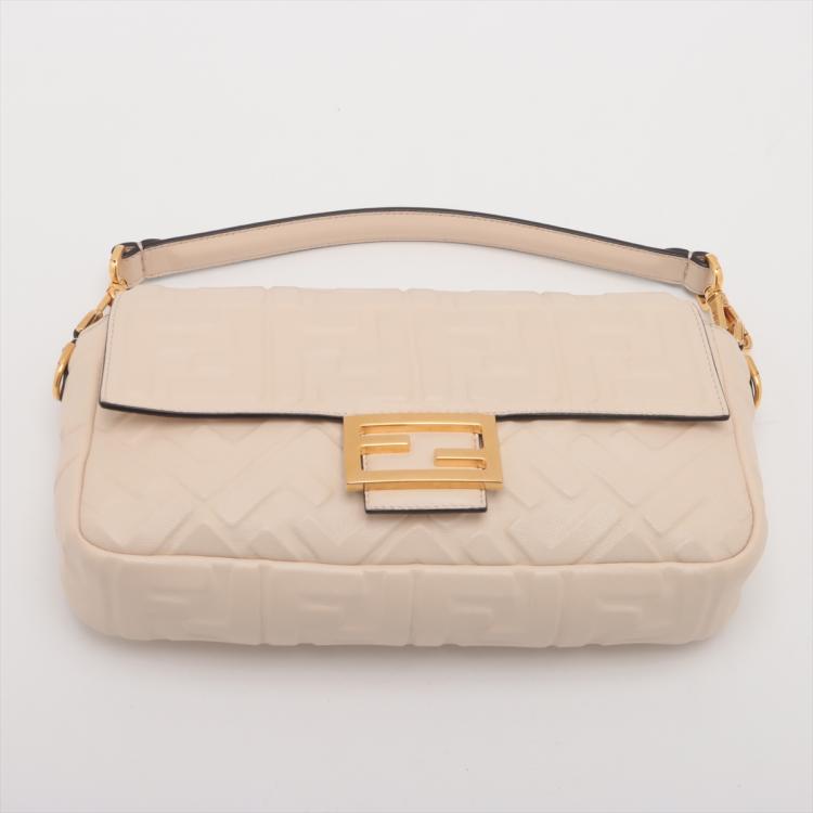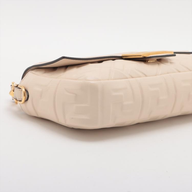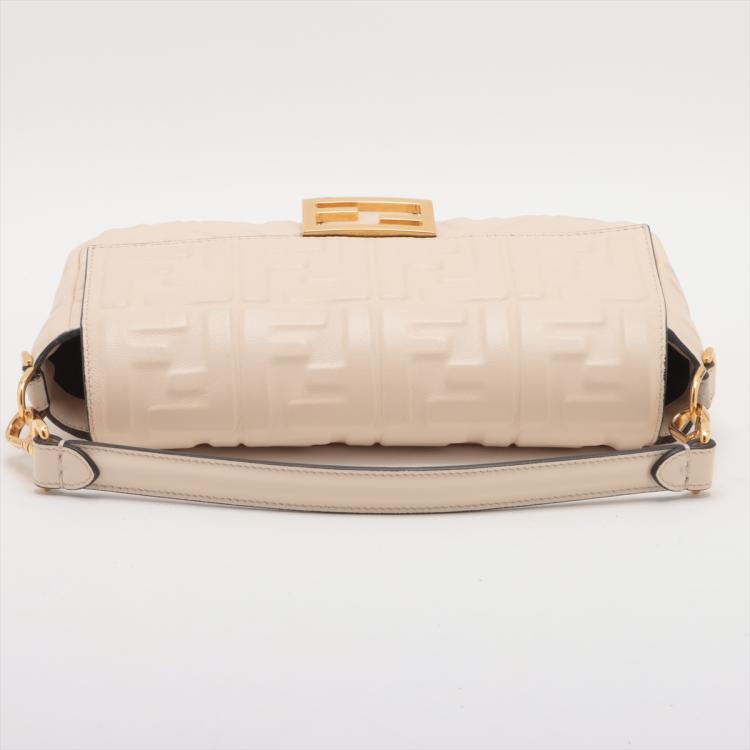 Fendi Baguette bag beige lambskin leather with a 3D-effect embossed FF motif. Featuring underarm design with single handle, gold-tone hardware, front flap with FF logo detailed magnetic button closure. This opens to a brown fabric lining interior with a zip pocket. Approximate dimensions: 26cm(L) x 15cm(H) x 6cm(D), 16cm handle drop and 40cm strap drop, removable. Accompanied by Fendi dustbag and box. With Entrupy Certificate of Authenticity. (Pre-owned)