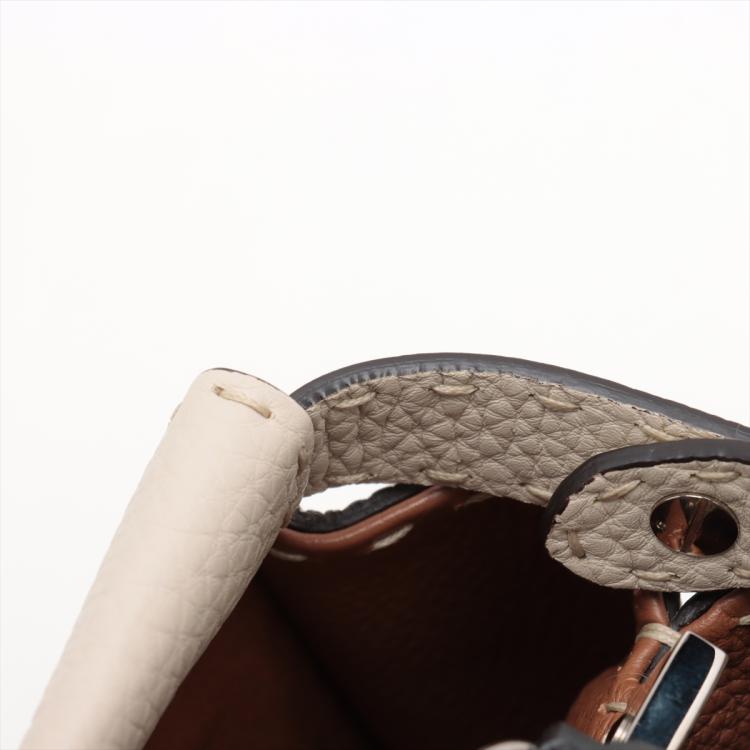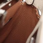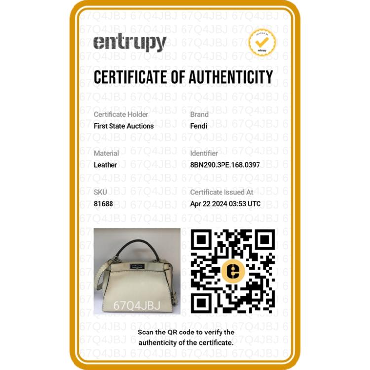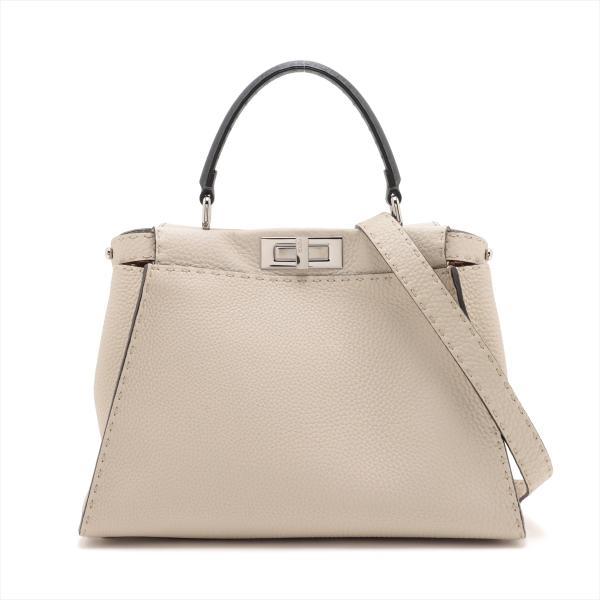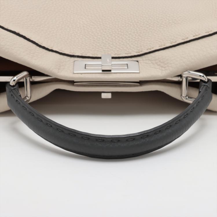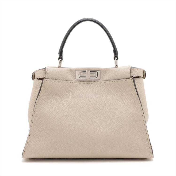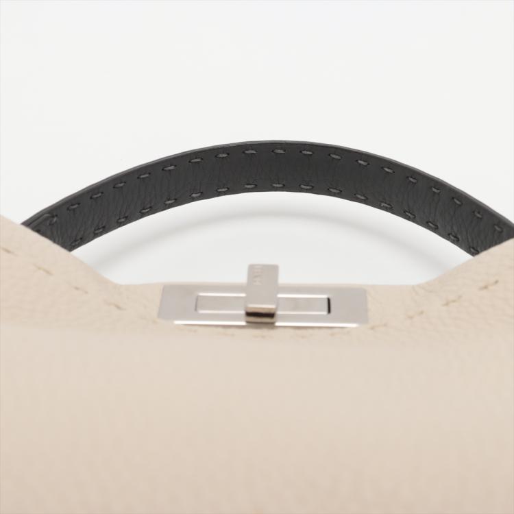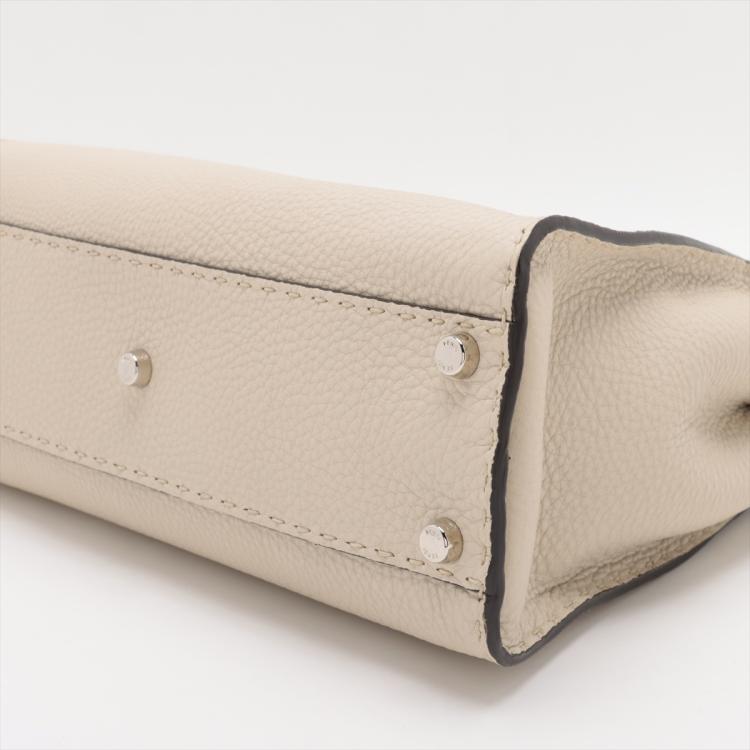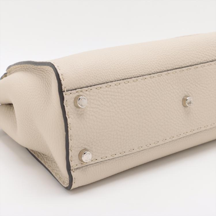 Fendi medium Selleria Peekaboo 2way bag in beige leather. Featuring silver-tone hardware, single black leather handle, turn-lock closures at front and back. The top opens to two compartments lined in brown leather and microfibre and with zipped and patch pockets. Approximate dimensions: 34cm(L) x 24cm(H) x 14cm(D), handle drop: 12cm, strap drop: 54cm adjustable. Accompanied by a Fendi dust bag and info cards. With Entrupy Certificate of Authenticity. (Pre-owned)