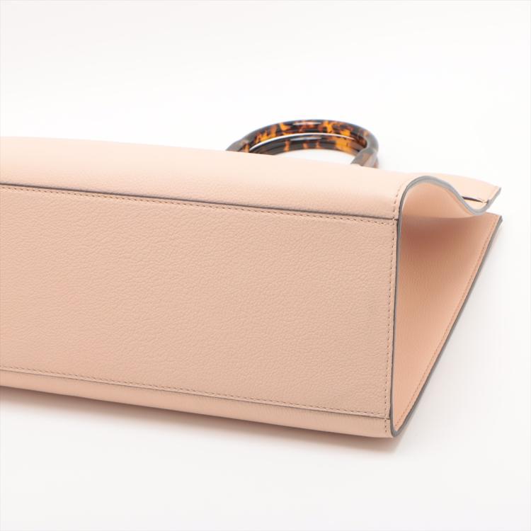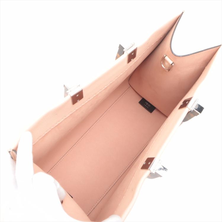 Fendi medium Sunshine tote bag in light pink grainy calfskin leather. Featuring an embossed Fendi logo at front, dual tortoiseshell top handles, detachable shoulder strap, and silver-toned hardware. The top opens to a colour matching pink microfibre interior. Approximate dimensions: 35cm(L) x 31cm(H) x 15cm(D), handle drop 11cm, strap drop 41.5cm. With Entrupy Certificate of Authenticity. (Pre-owned)