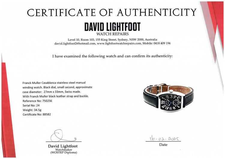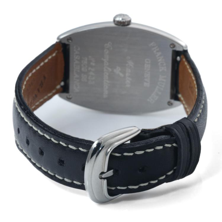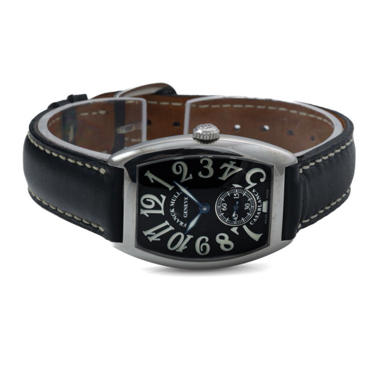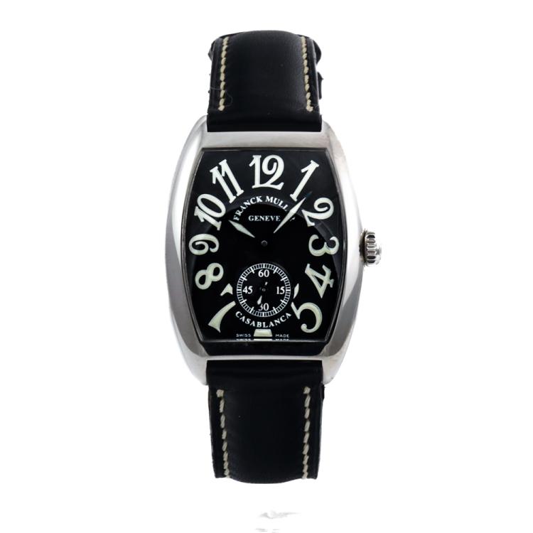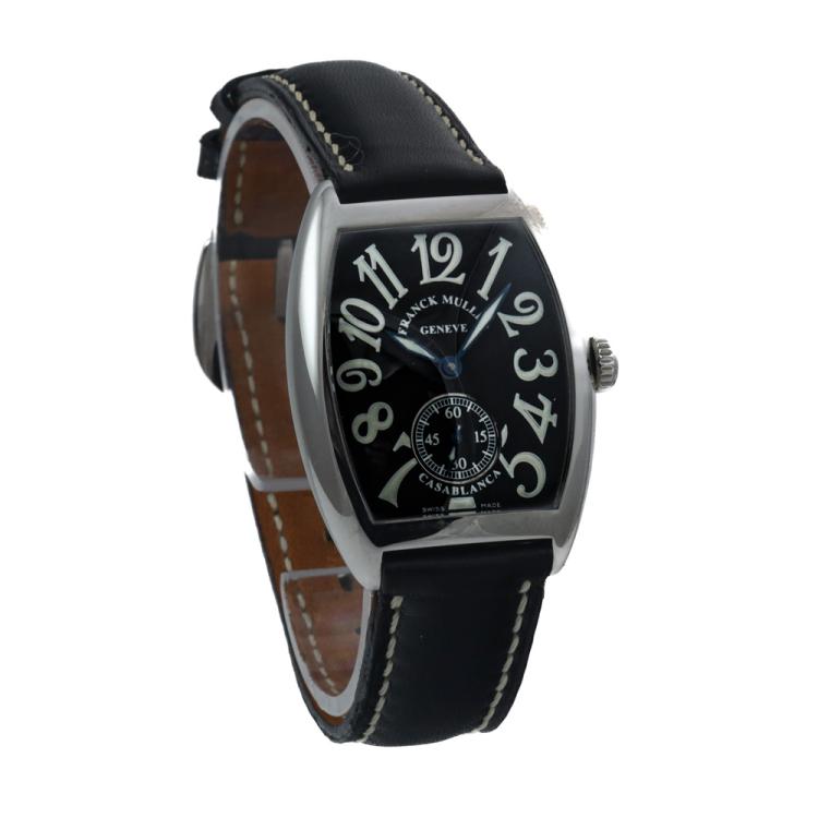Franck Muller Casablanca stainless steel manual winding ladies watch. Black dial, small second, approximate case diameter: 27mm x 33mm, strap length: 19cm, Swiss made. Ref# 7502S6. With Franck Muller black leather strap and buckle. With Certificate of Authenticity and Franck Muller box. 3 month FSA warranty. (Pre-owned)