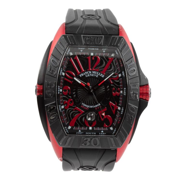Franck Muller Conquistador Grand Prix titanium automatic mens watch. Black dial, date, case diameter: 45mm x 38mm, wrist size: 18cm, Swiss made. Ref# 8900SCDTGPG. With Franck Muller black rubber strap and clasp. With Certificate of Authenticity, Undated Franck Muller Certificate of Origin & Warranty and Franck Muller box. 3 month FSA warranty. (Pre-owned)