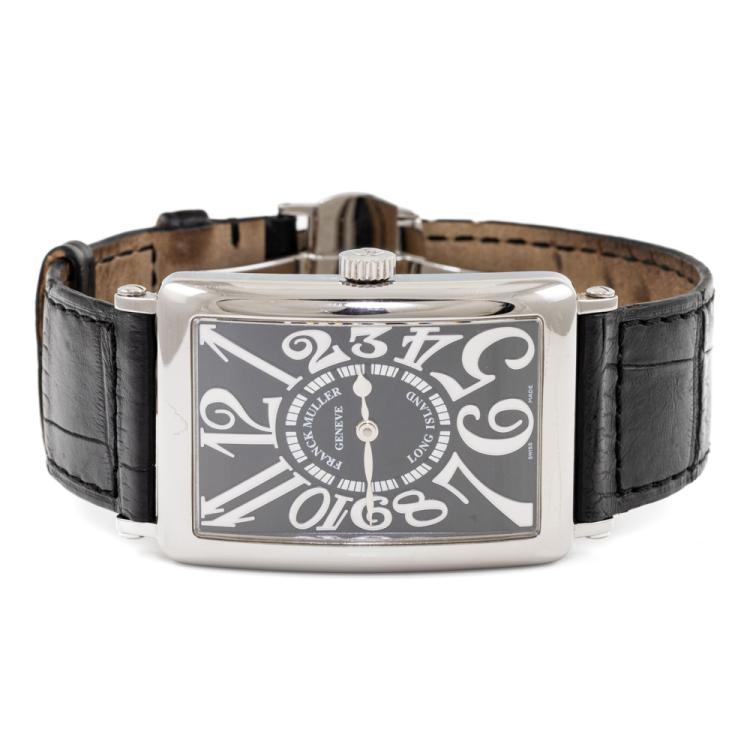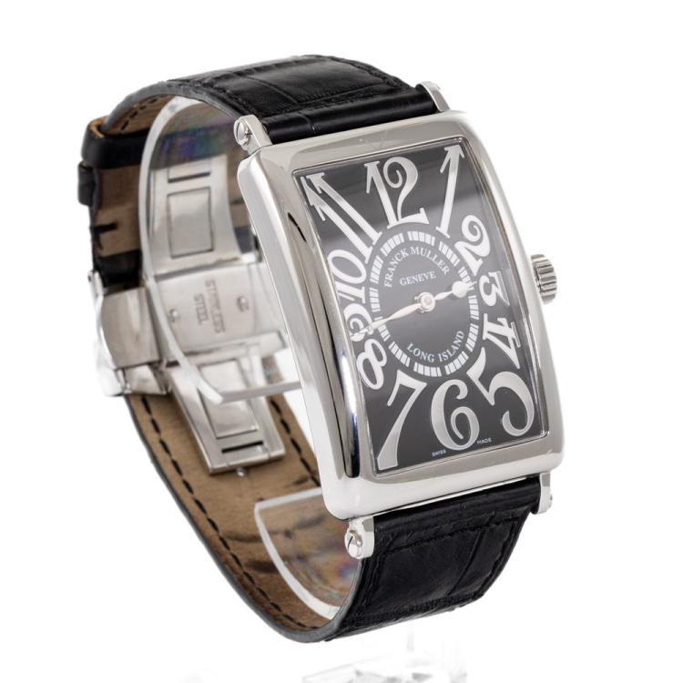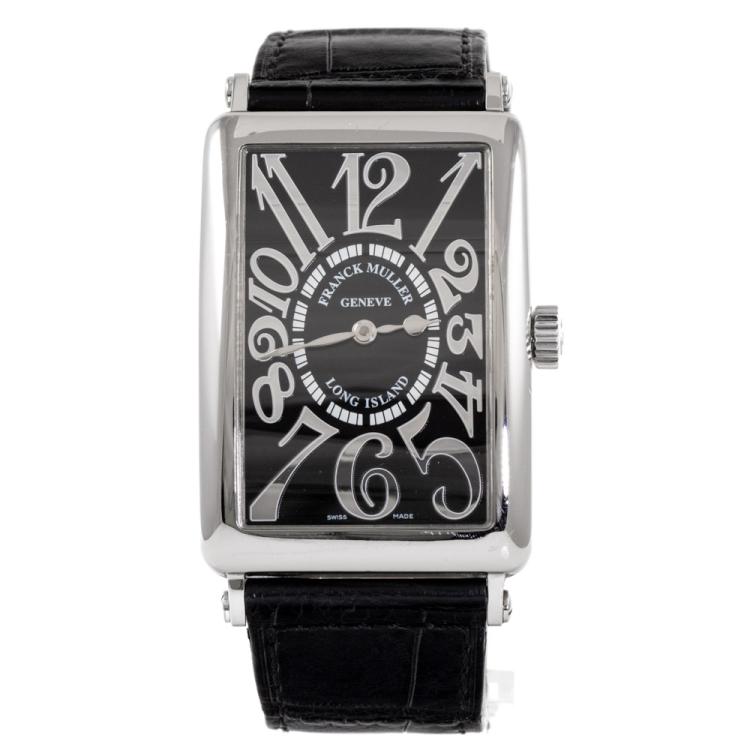 Franck Muller Long Island stainless steel automatic mens watch. Black dial, case diameter: 43mm x 30mm, strap length: 19cm, Swiss made. Ref #1000SC. With Franck Muller black leather strap and buckle. With Certificate of Authenticity, Franck Muller Certificate of Origin & Warranty dated 15/01/2016 and Franck Muller box. 3 month FSA warranty (Pre-owned)